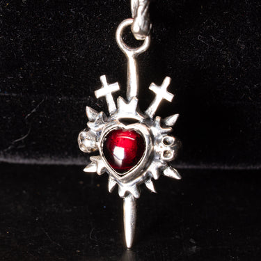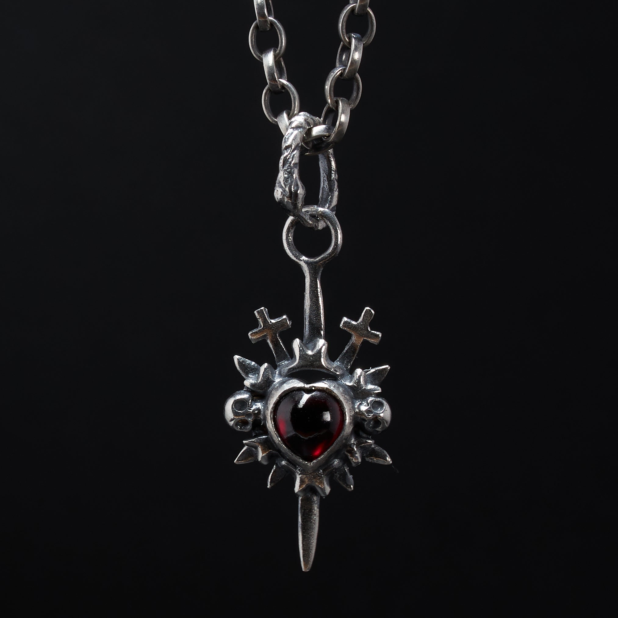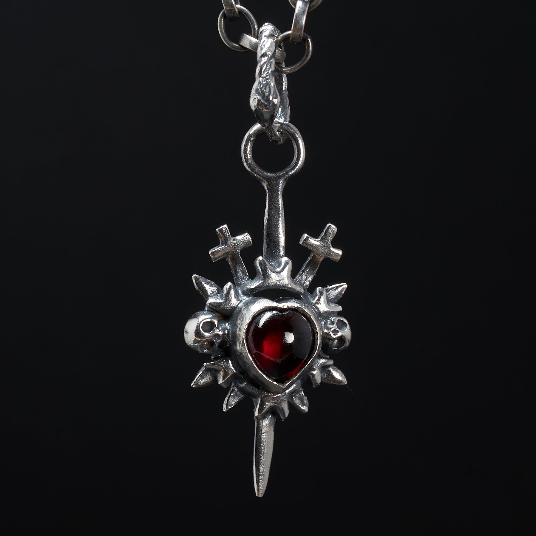 The Metal: A 7mm heart shaped Indian garnet griped in a sterling silver bezel, topped by Persephone's 'Crown of Elysium' which is echoed below. The crown above the heart representing Persephone's time on Earth, the one below her time in the Underworld and the balance and cycle of the seasons.