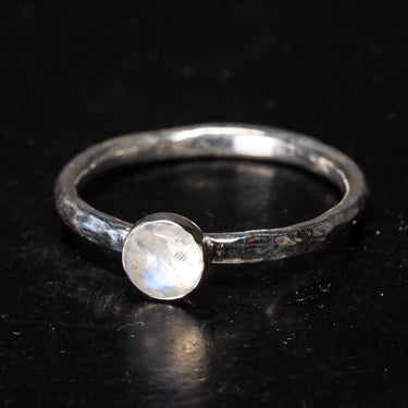 The Metal: Forged of recycled sterling silver or 9ct gold and ethically sourced stones. This creation is handmade in our Nottingham workshop with a smooth, natural 5mm Rainbow Moonstone sitting on a hammered metal band. If you usually find it hard to find rings in your size, don’t worry, we cater to every finger from tiny to tremendous.
