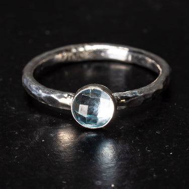 The Metal: Forged of recycled sterling silver or 9ct gold and ethically sourced stones. This creation is handmade in our Nottingham workshop with a 5mm facetted Sky Blue Topaz sitting on a hammered metal band. If you usually find it hard to find rings in your size, don’t worry, we cater to every finger from tiny to tremendous.