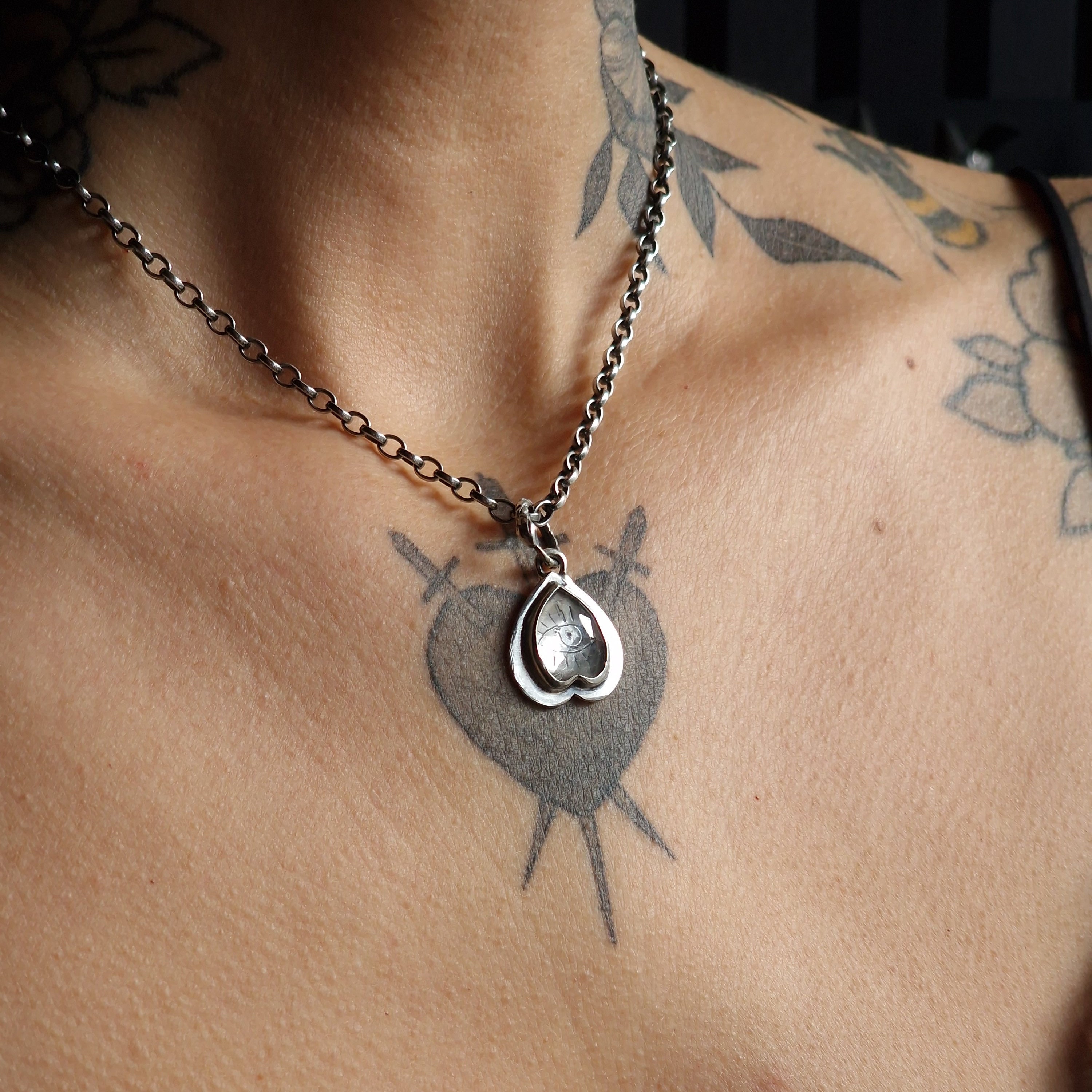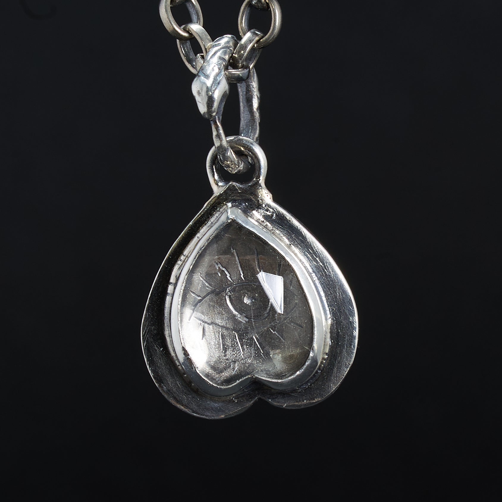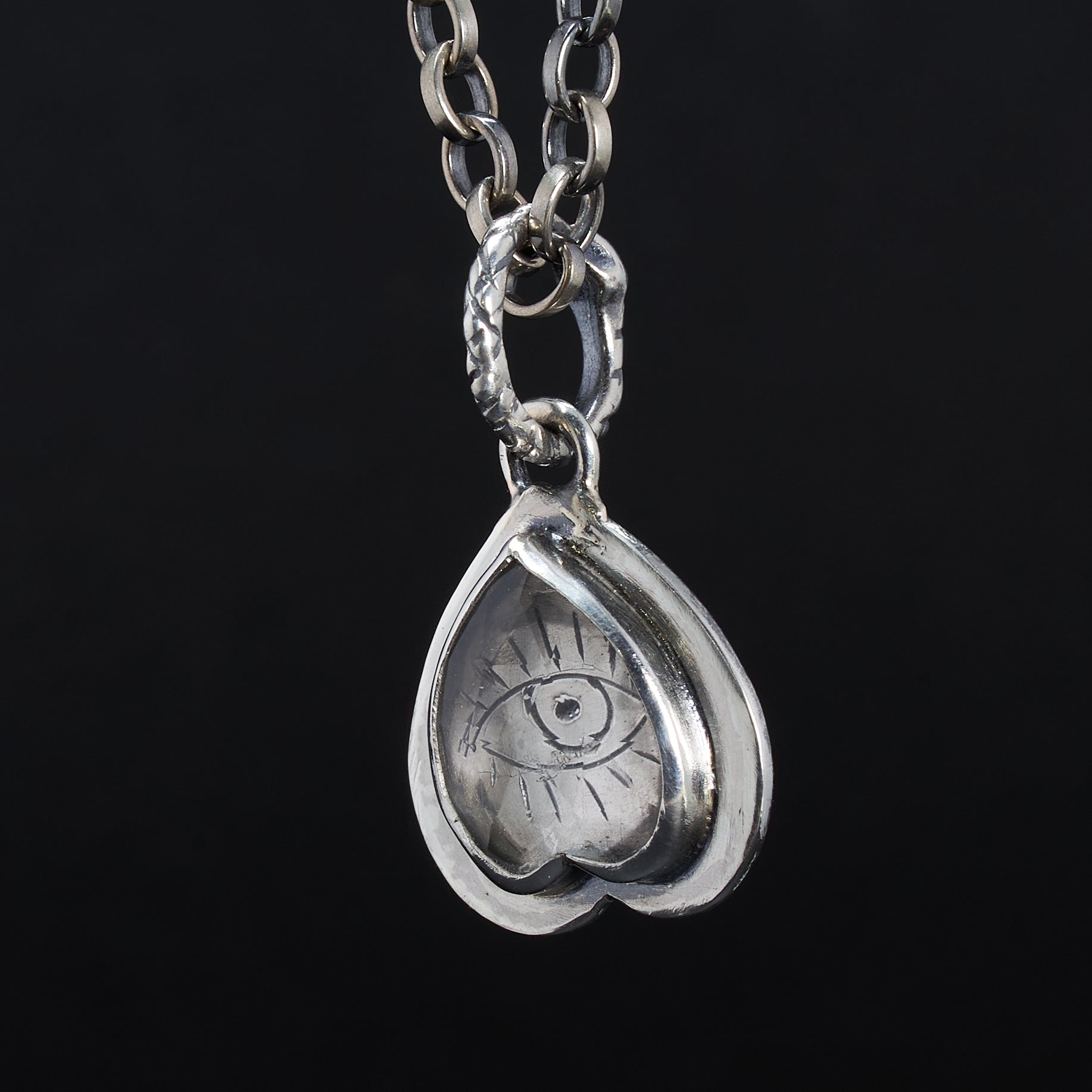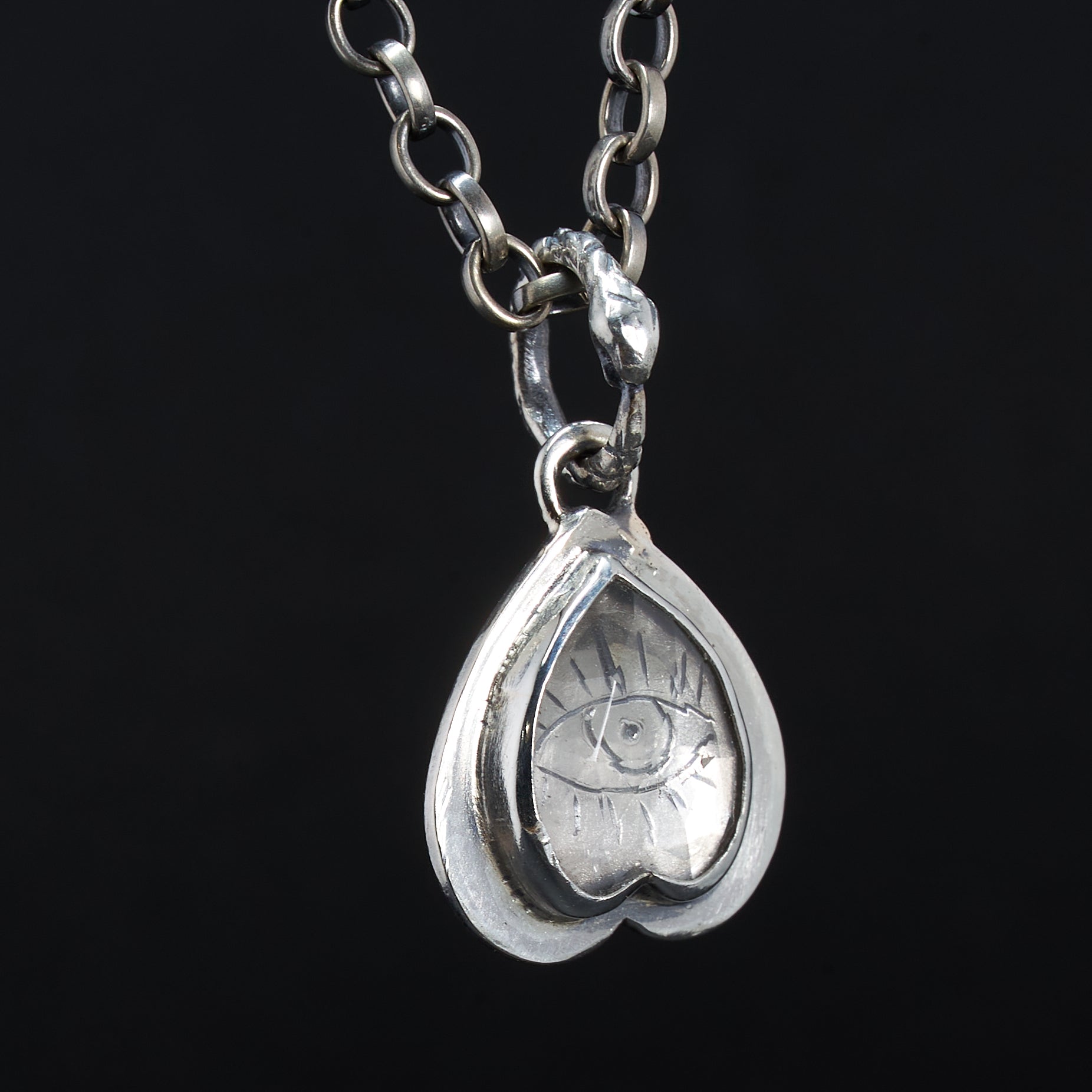 The Magic: A Clear Quartz heart refracts light into a hand-engraved eye, focusing your vision and sharpening inner sight. The heart, turned upside down, the shape of the planchette is a symbol of connection to the unseen.