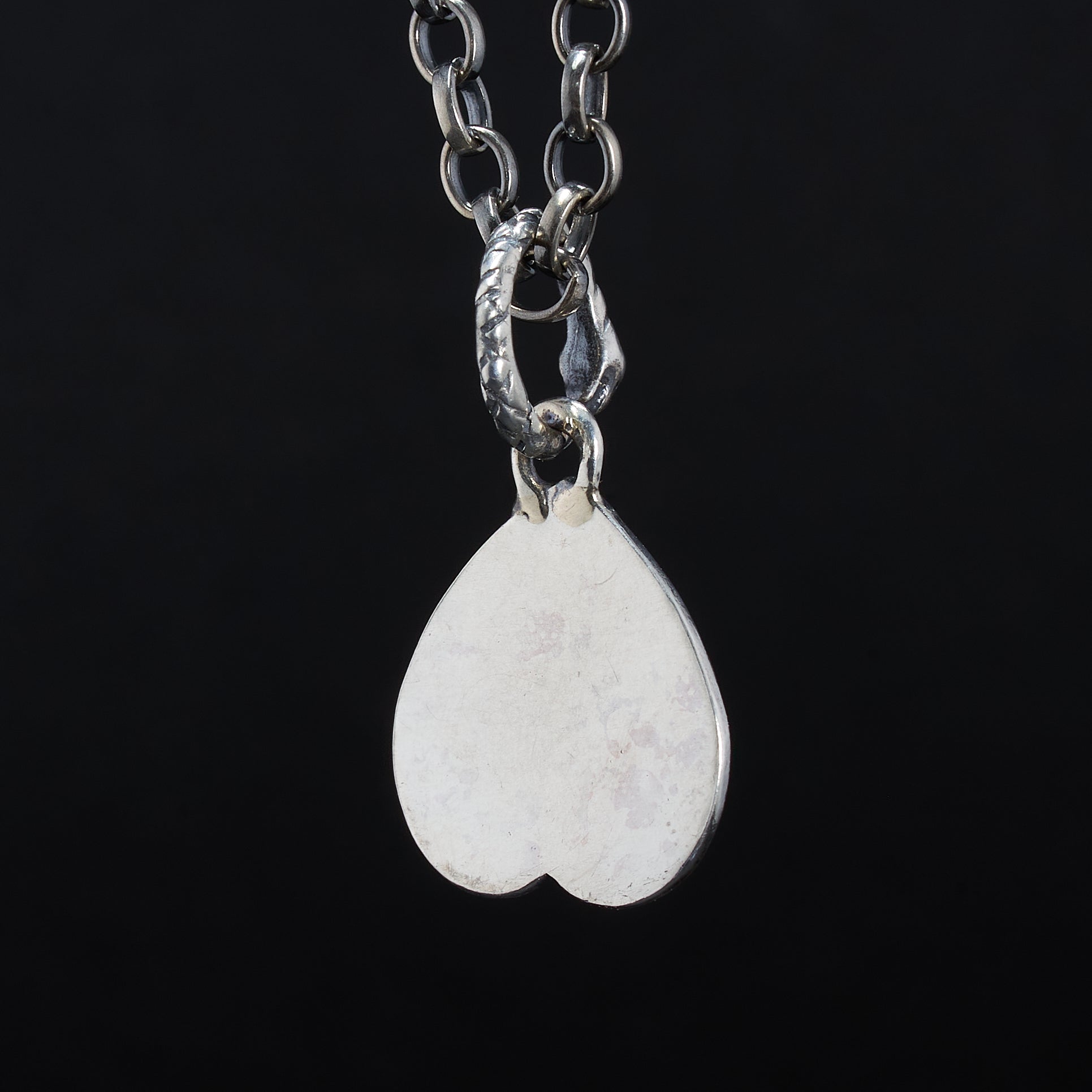 The Metal: A 10mm by 14mm heart shaped clear quartz held tightly in a sterling silver bezel on a heart shaped silver back plate. A signature Bonearrow snake ring allows this charm to be hung on any chain, though if you don't have one you can order one here.