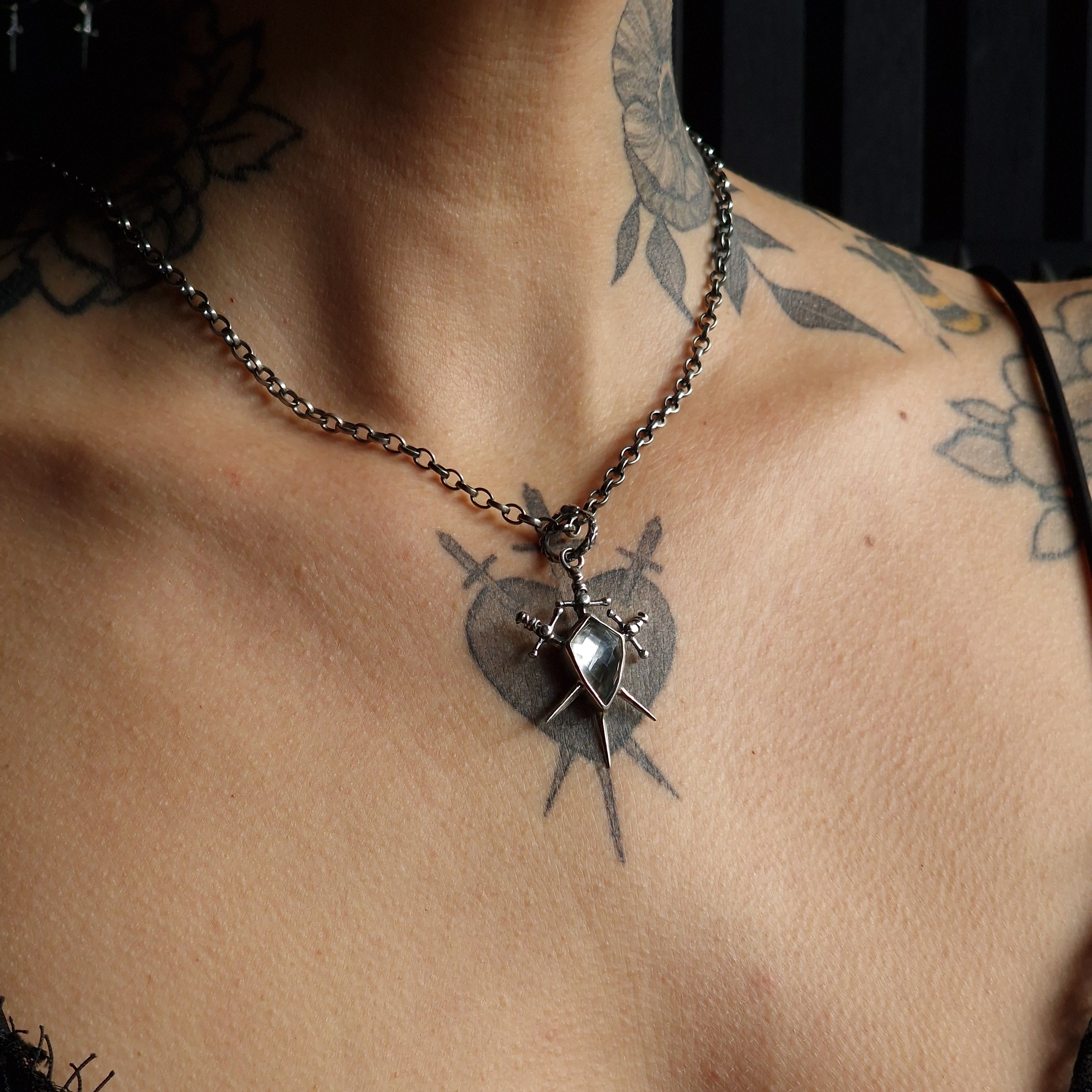The Magic: A Clear Quartz shield pierced by three silver swords. Just like the three of swords in the tarot, this pendant is a talisman of resilience, courage and strength through struggle - a reminder of the battle you have won.