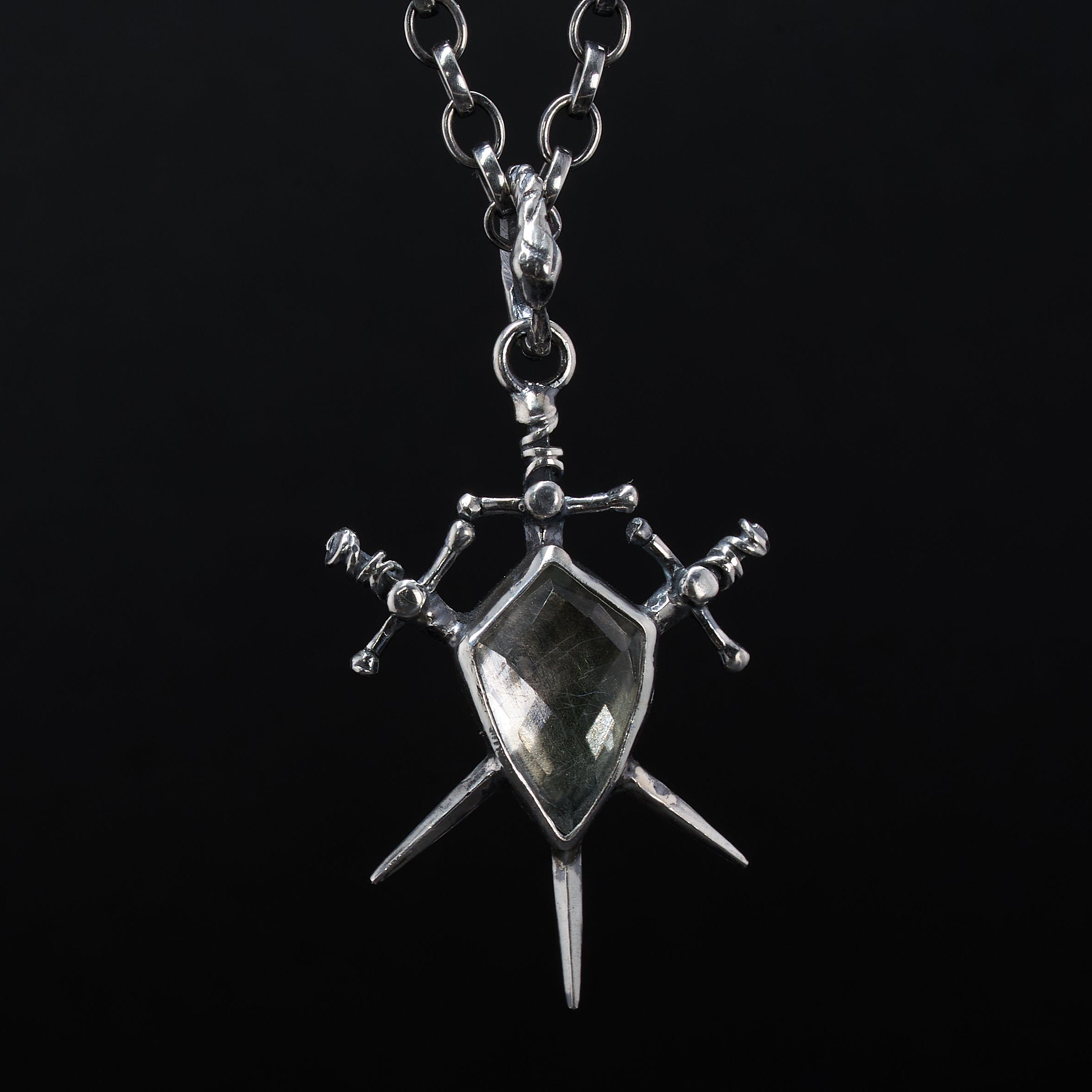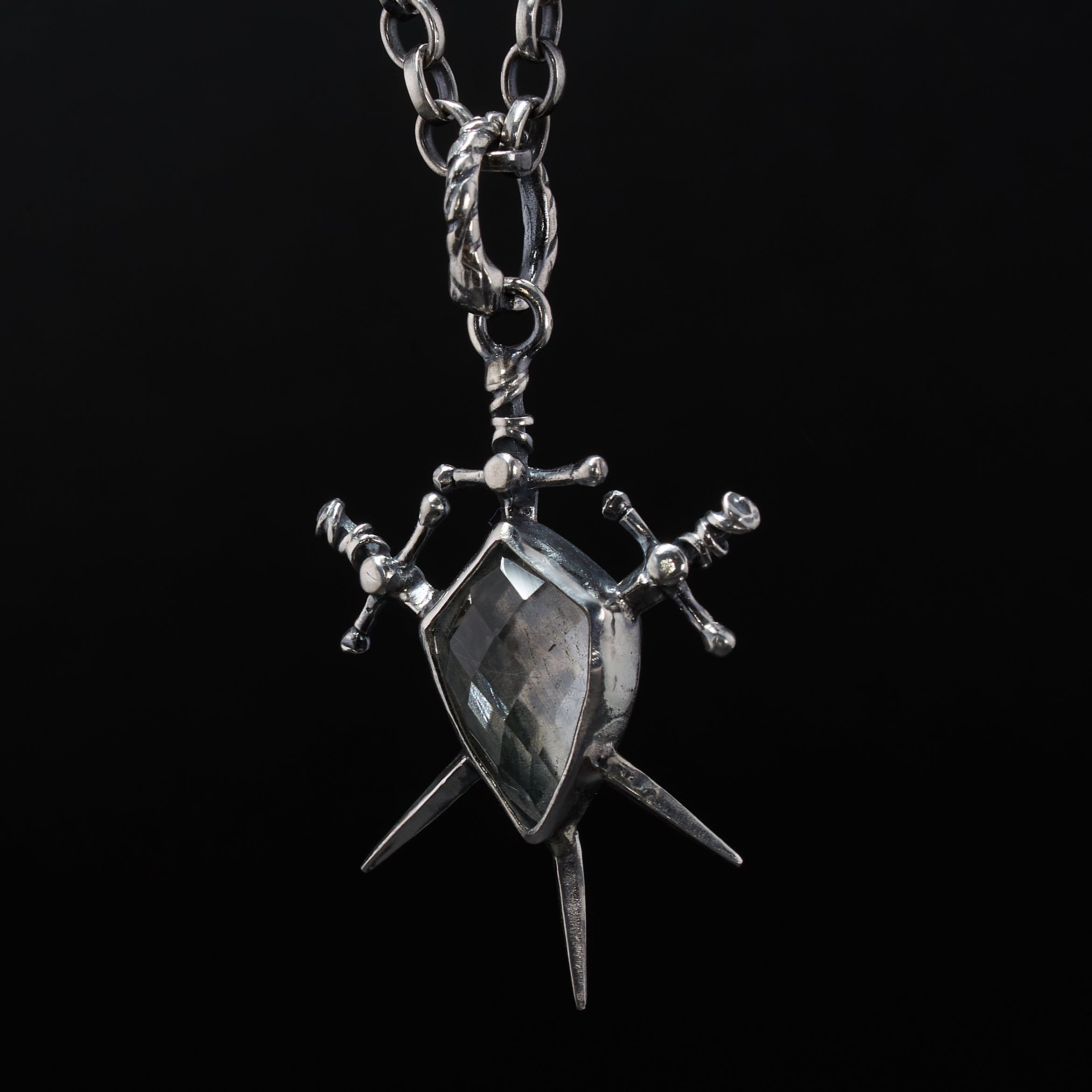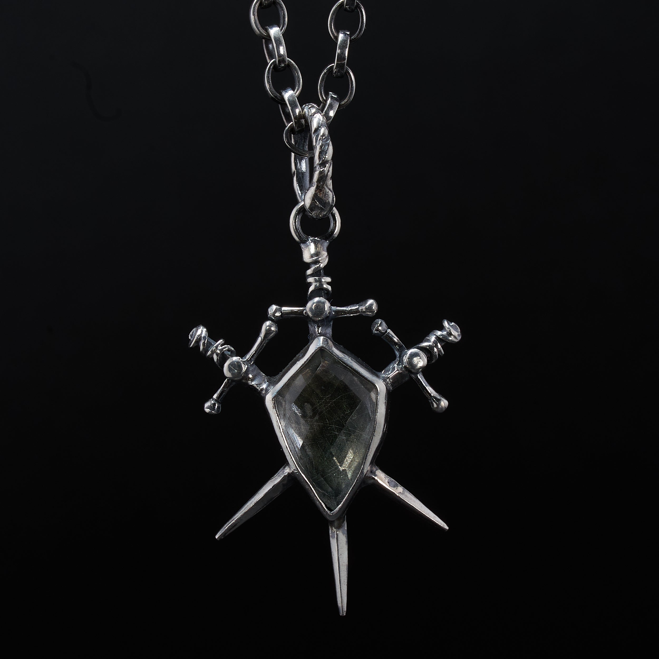 The Metal: An 11mm by 14mm shield shaped clear quartz held tightly in a sterling silver bezel pierced by the three swords. This pendant comes on an 18" signature Bonearrow belcher with a 2' extender so it can be worn at either 18 or 20 inches.