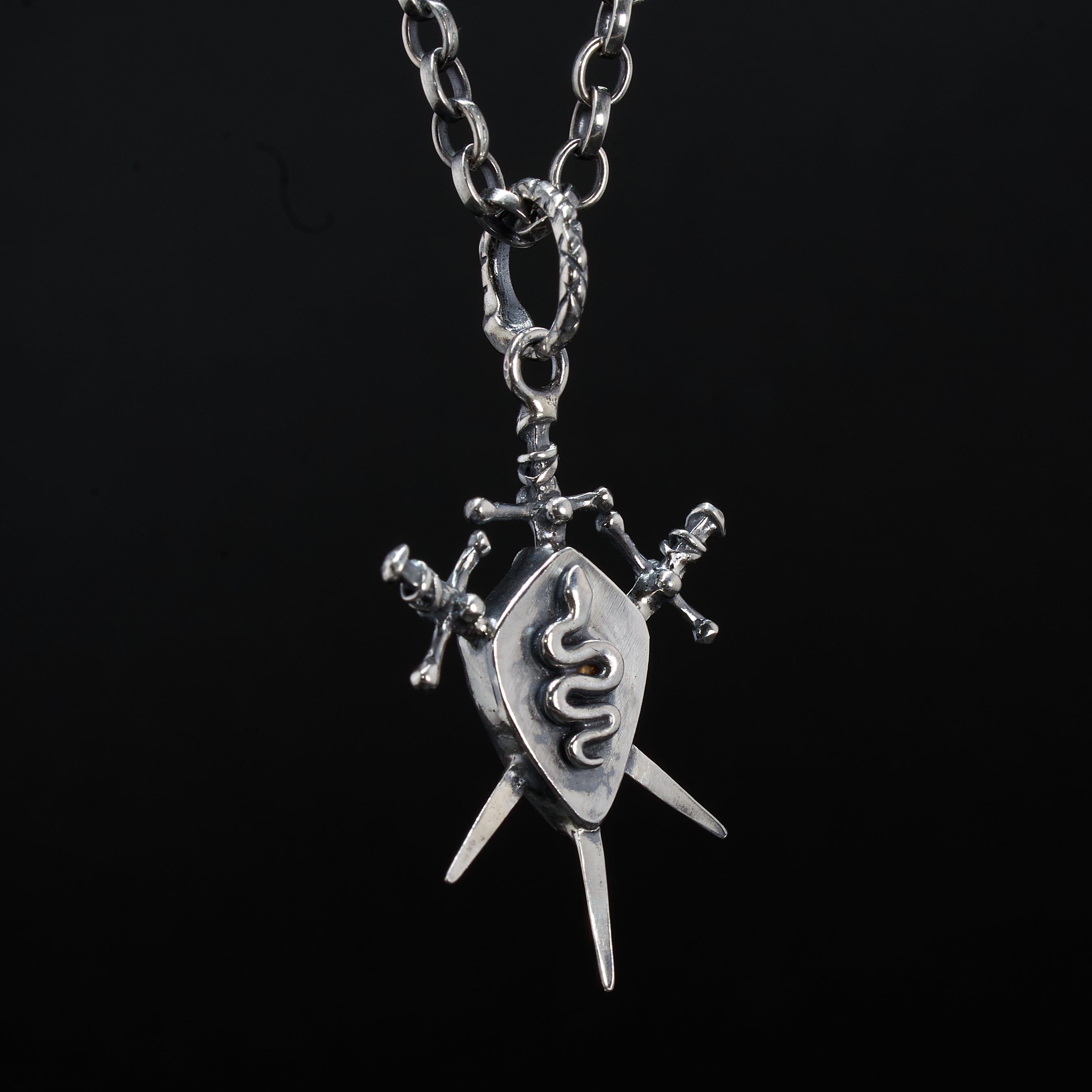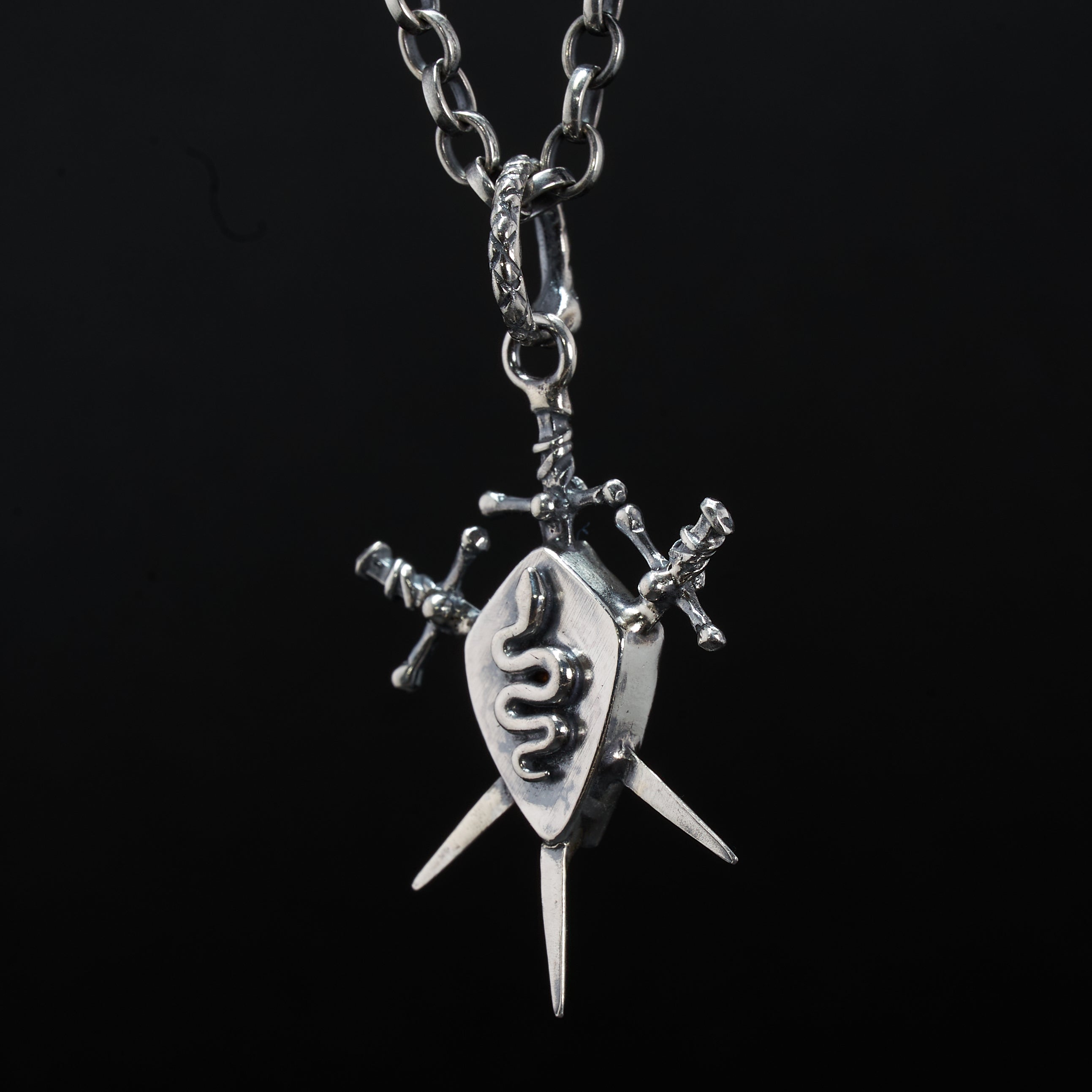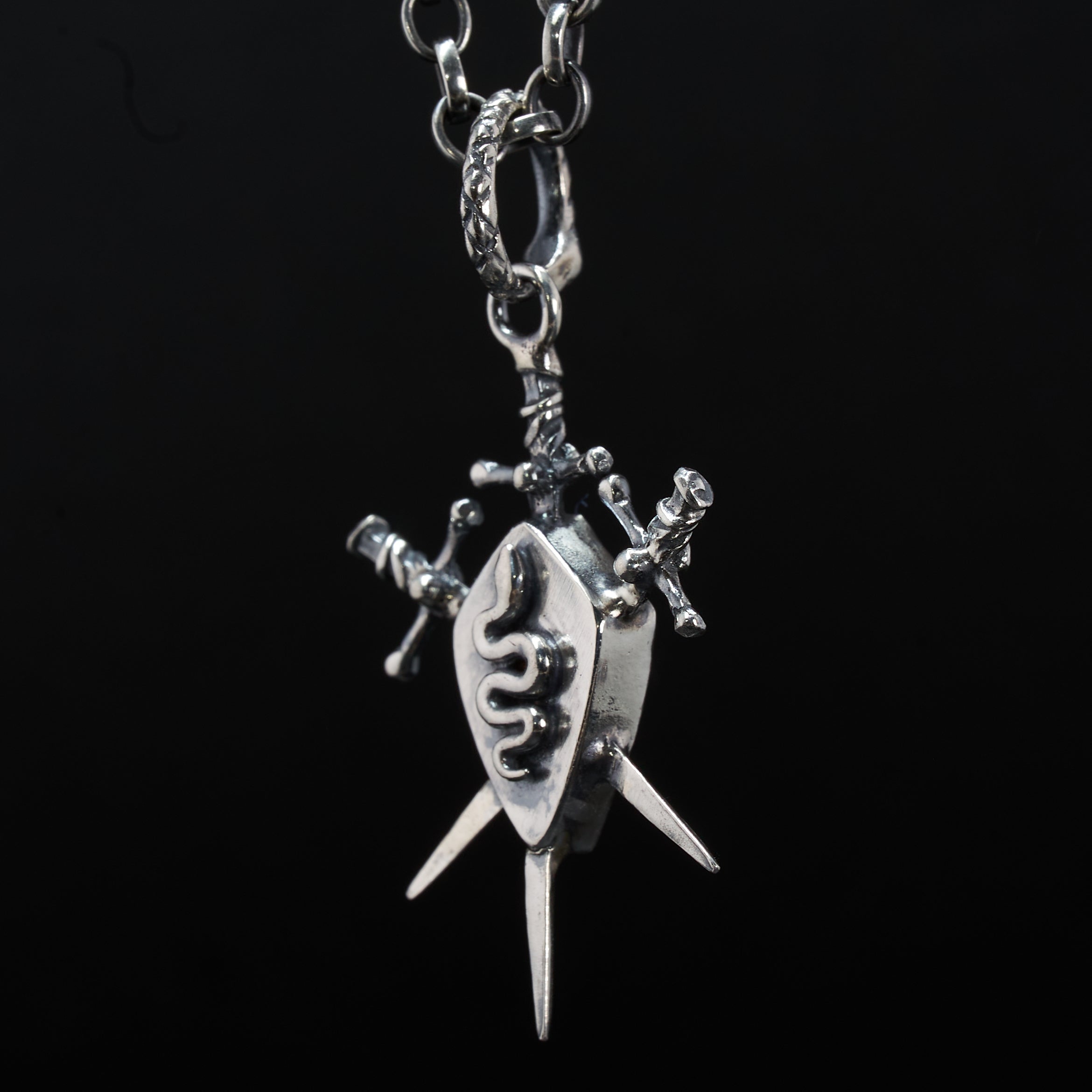 The Metal: An 11mm by 14mm shield shaped clear quartz held tightly in a sterling silver bezel pierced by the three swords. This pendant comes on an 18" signature Bonearrow belcher with a 2' extender so it can be worn at either 18 or 20 inches.