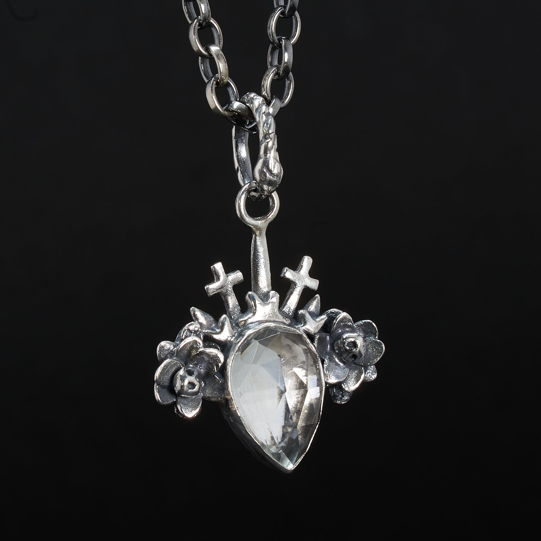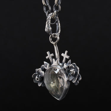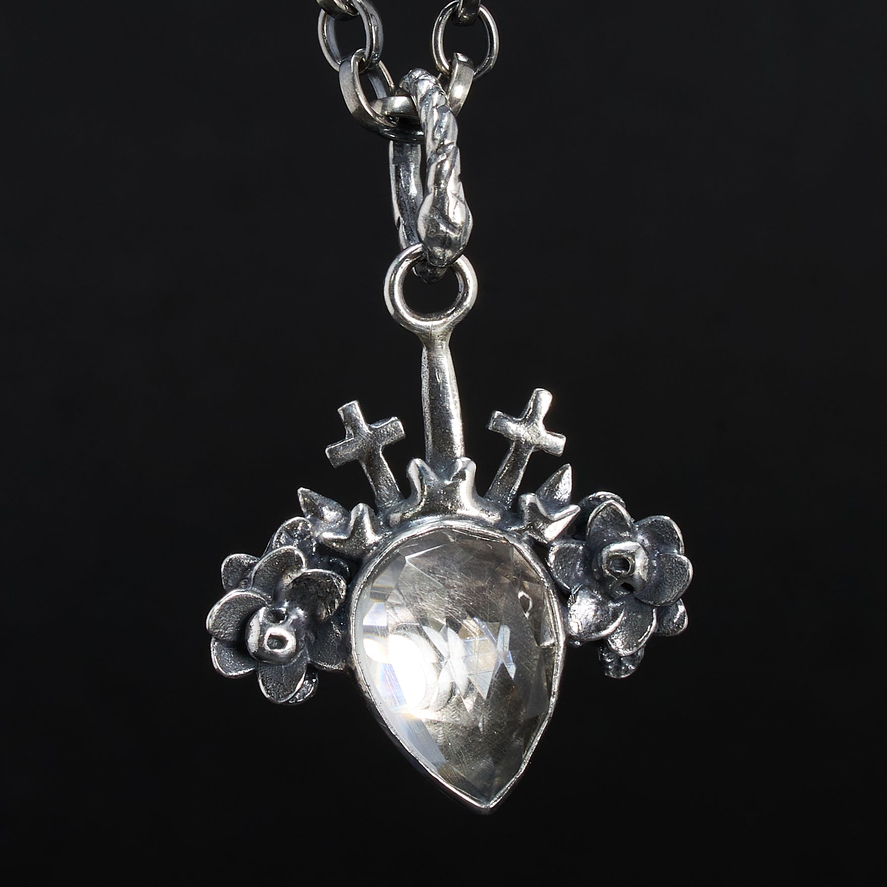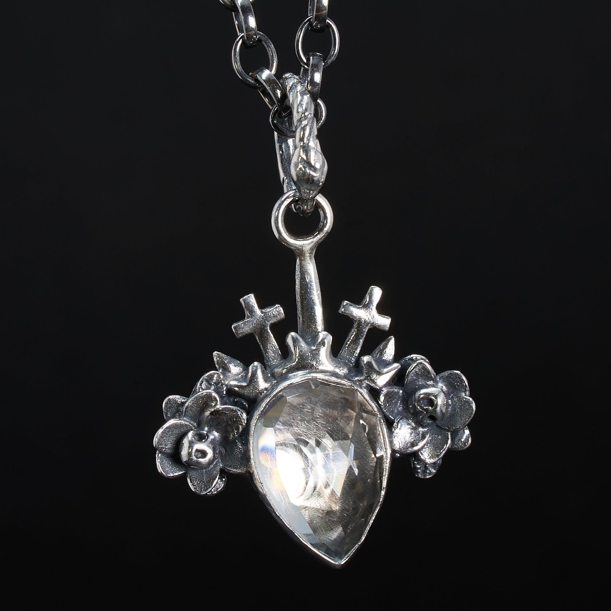 The Magic: A Clear Quartz heart shimmers between two beautiful, but deadly, belladonna flowers. Whisper your wisest words into the silvery depths of the stone and let them be safely locked away to call on whenever you need them, amplified and calling clear.