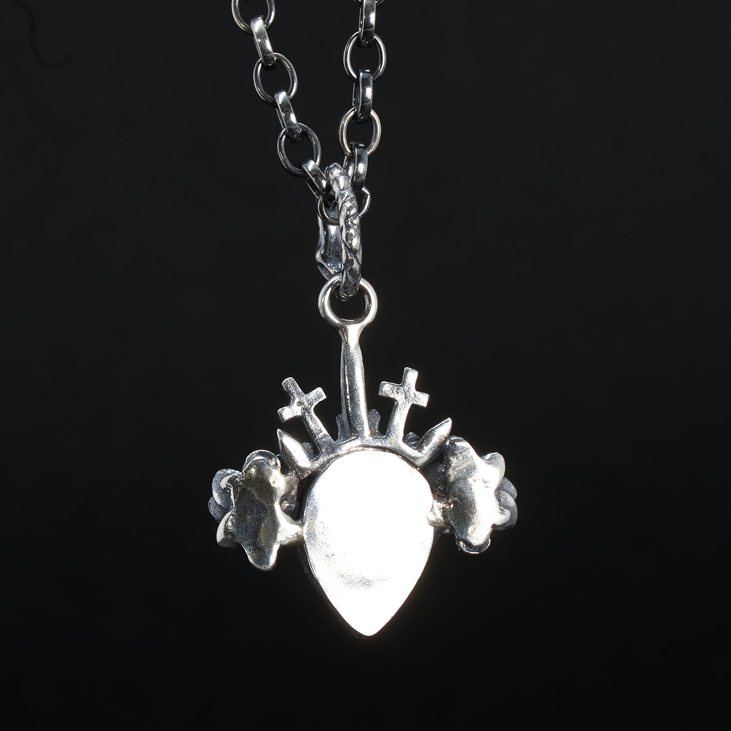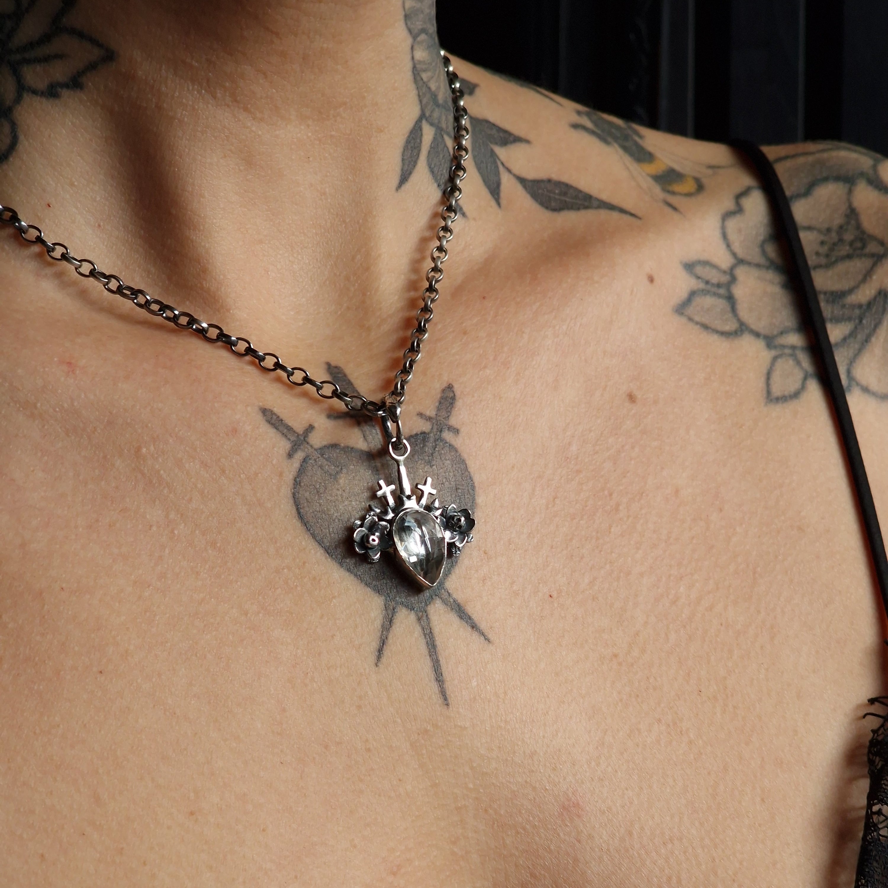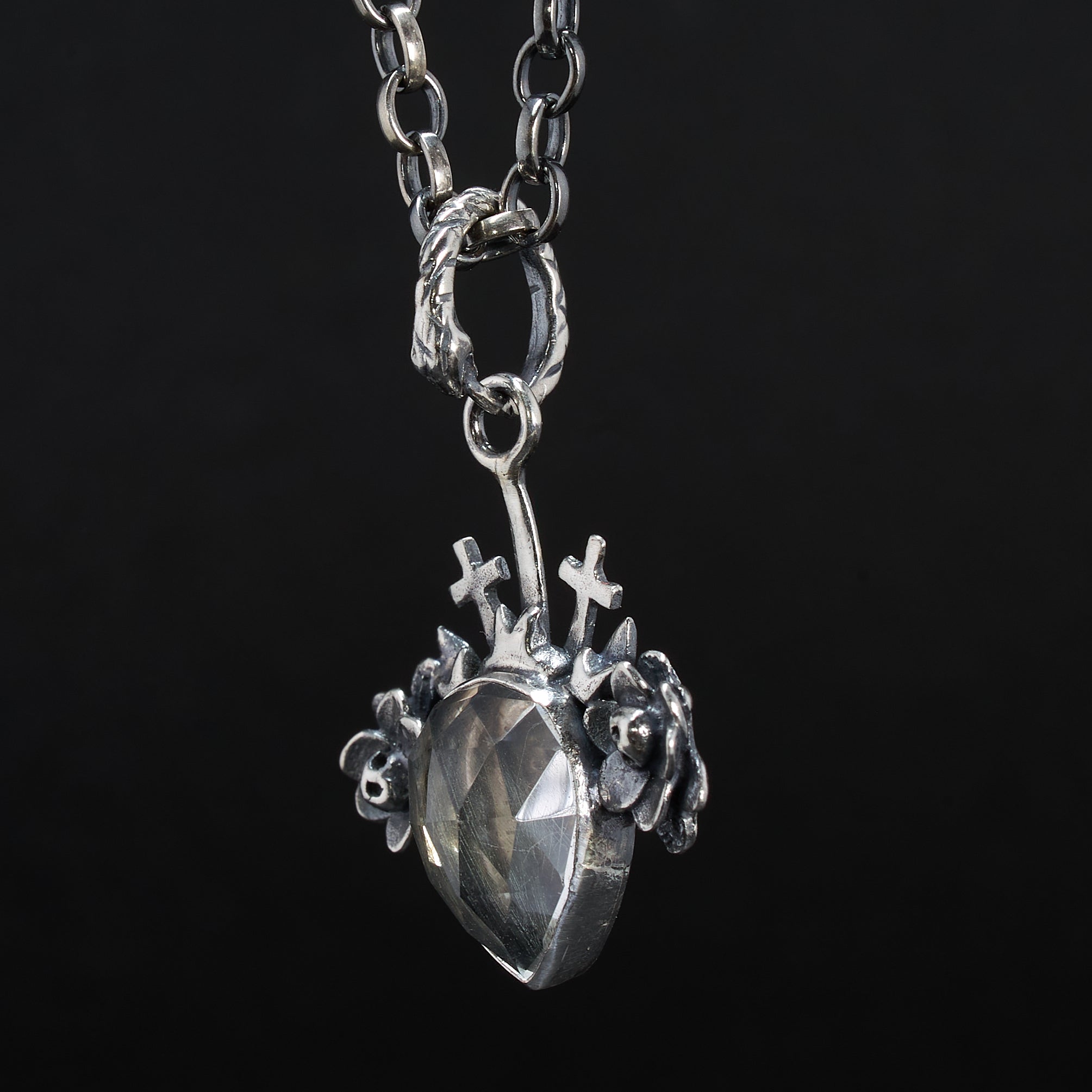 The Magic: A Clear Quartz heart shimmers between two beautiful, but deadly, belladonna flowers. Whisper your wisest words into the silvery depths of the stone and let them be safely locked away to call on whenever you need them, amplified and calling clear.