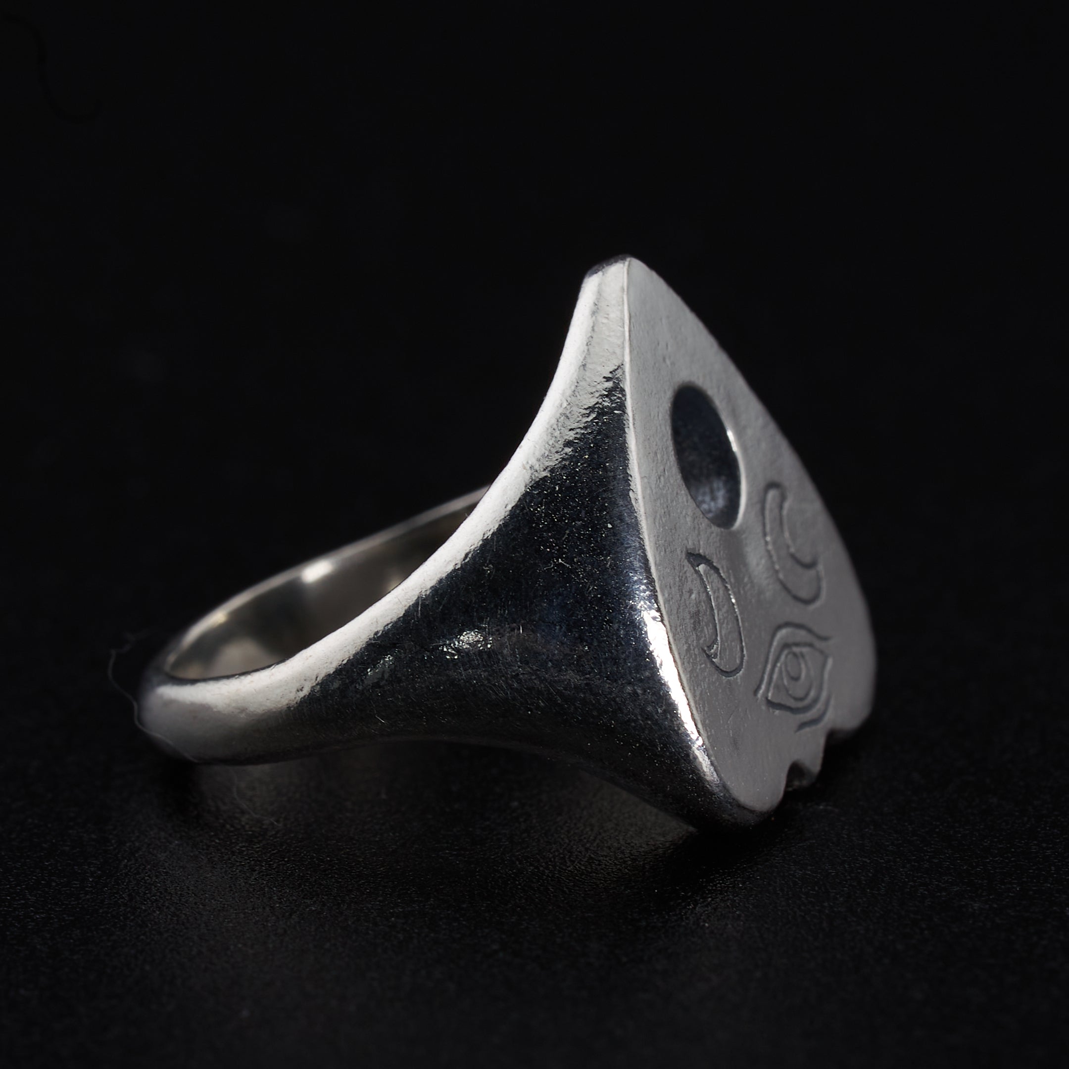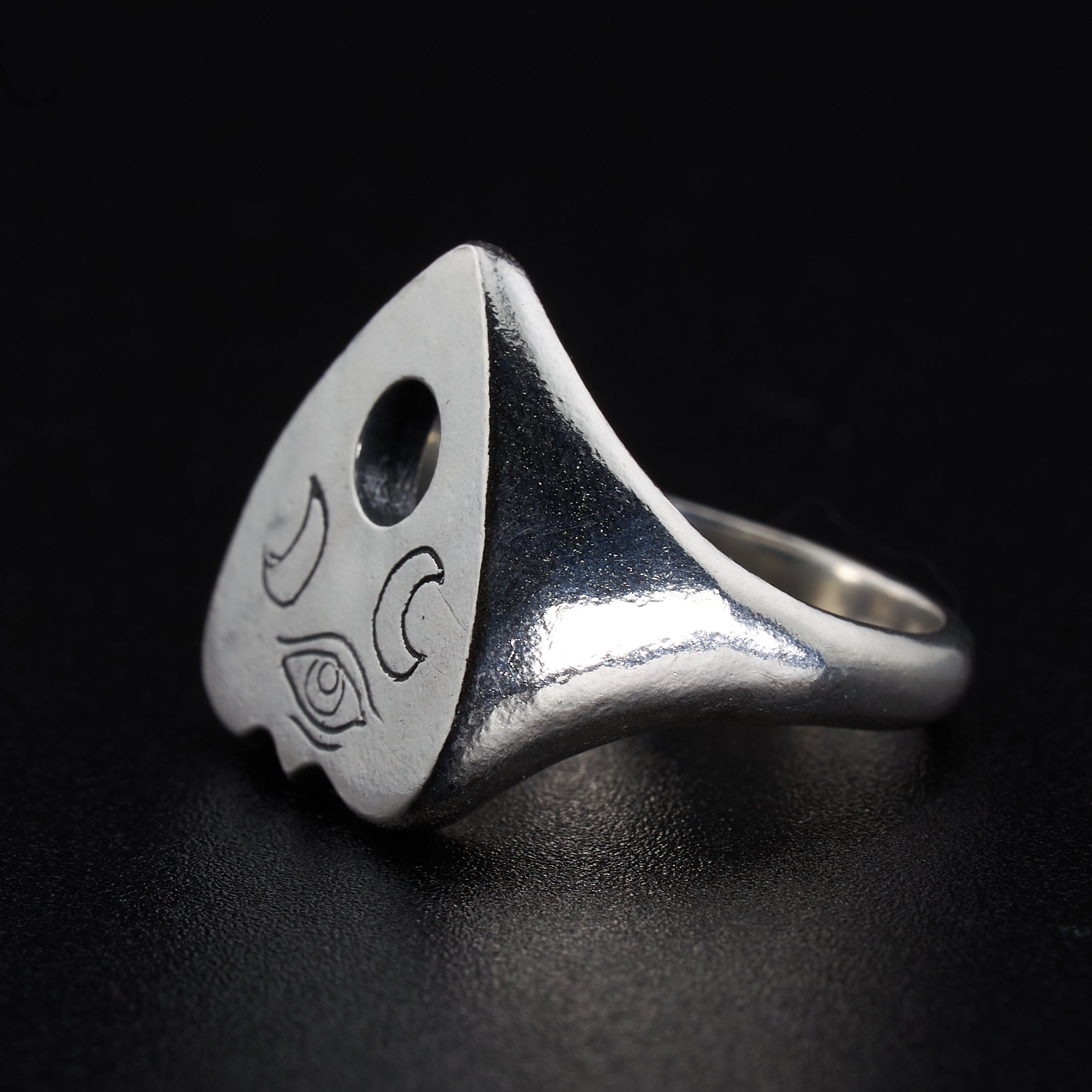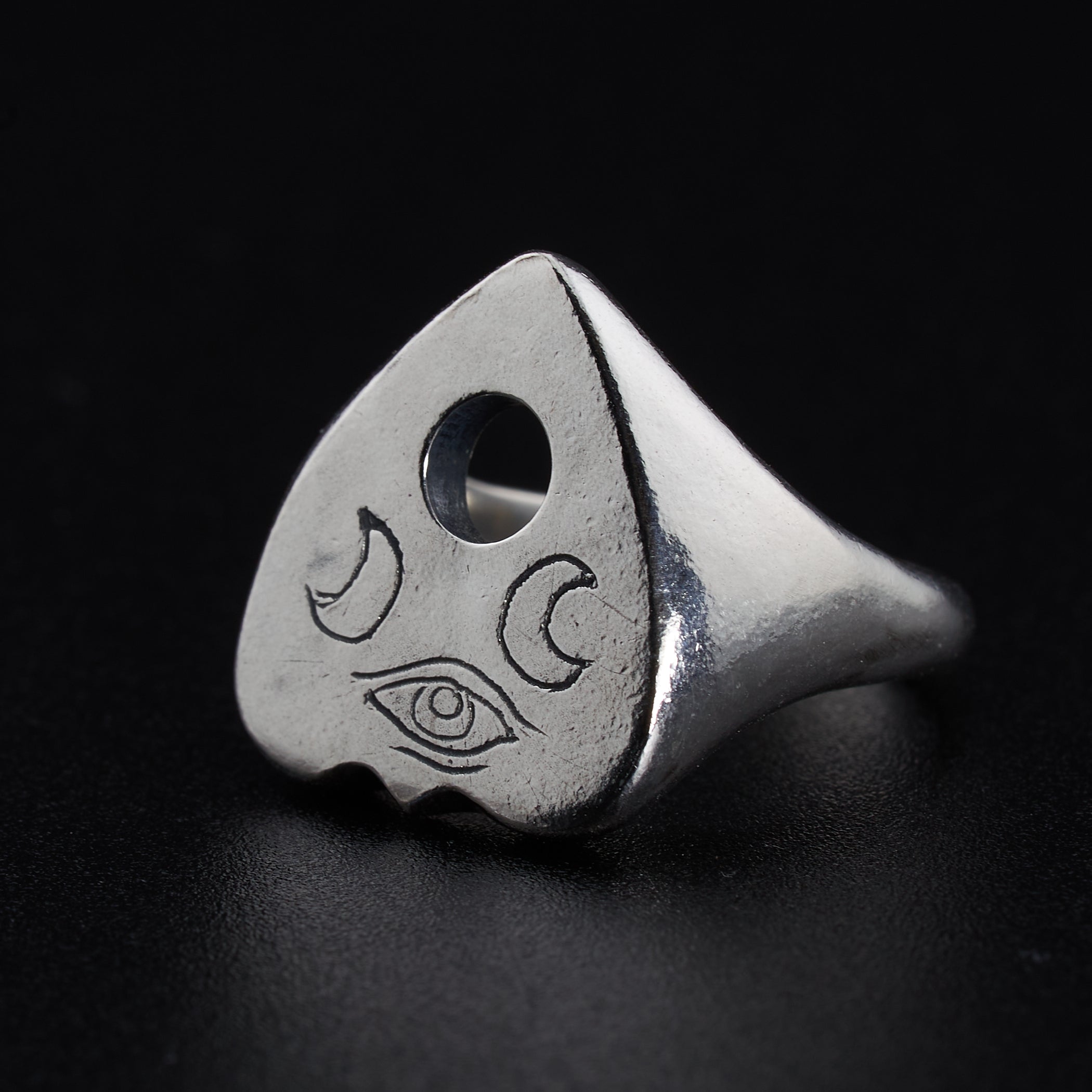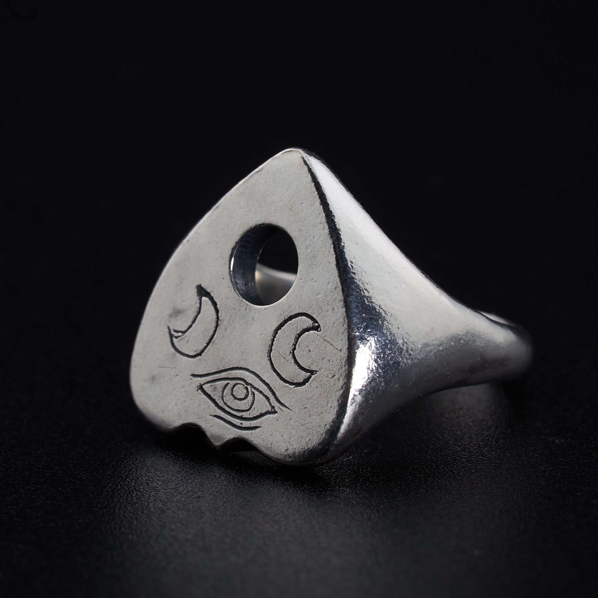 The Metal: A hand carved silver planchette shaped ring. Choose your size from the drop down menu.
