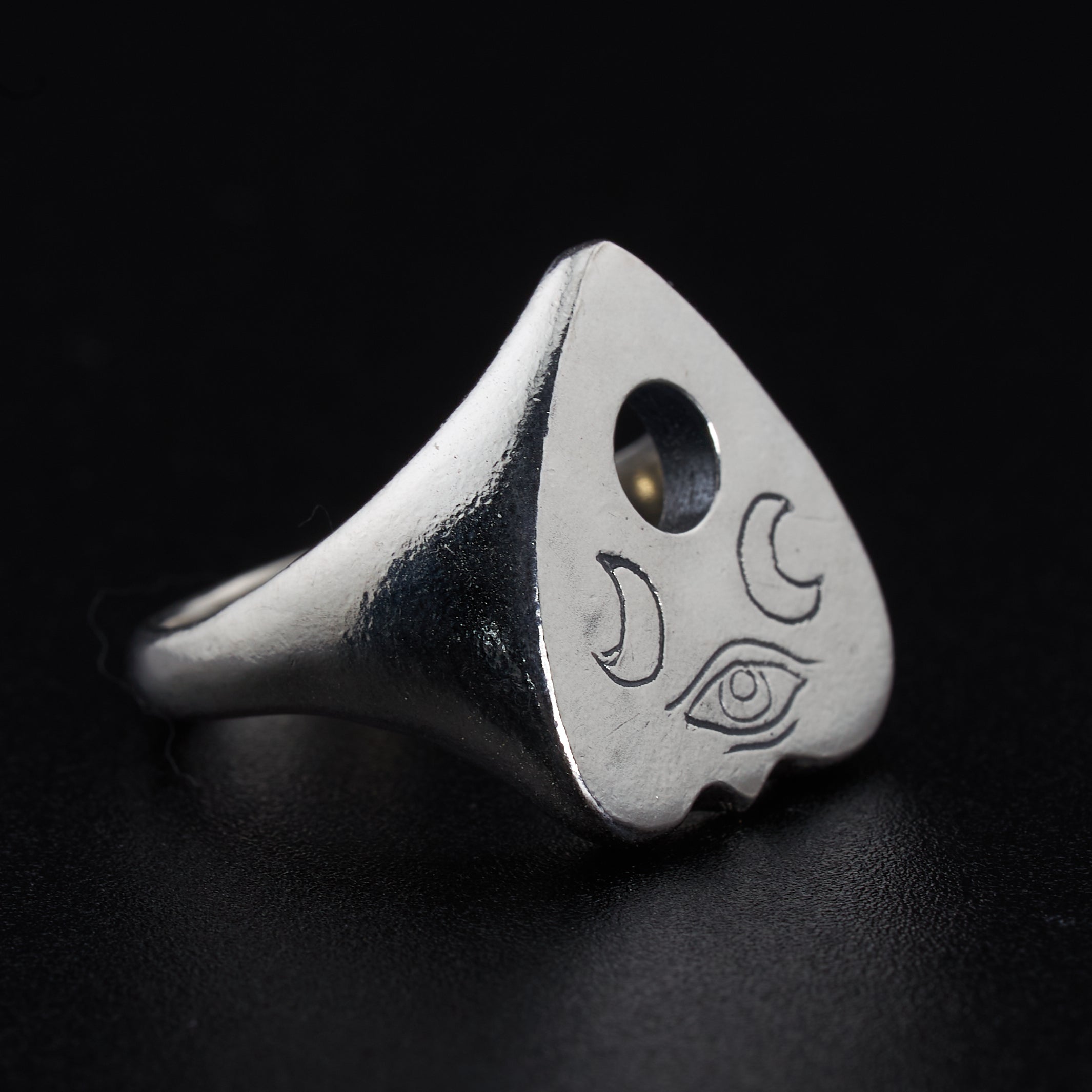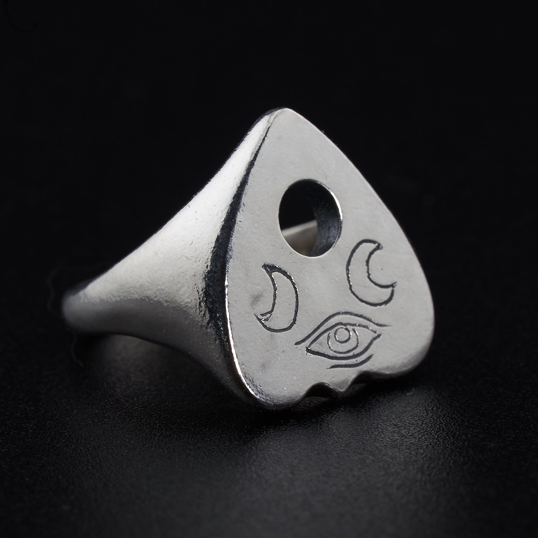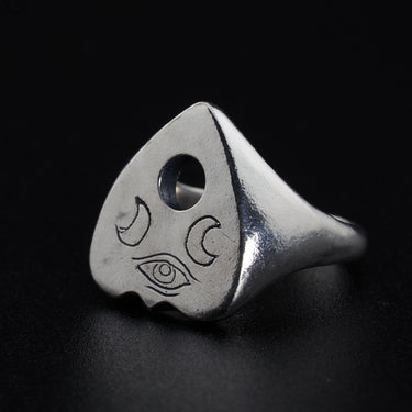 The Magic: A planchette shaped ring engraved with an all-seeing eye and waxing and waning crescent moons. A talisman for intuition, protection, and peeking beyond the veil. It's also super cute!