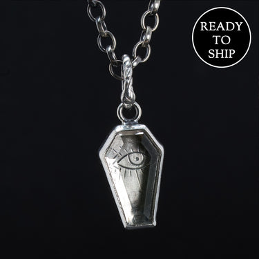 The Magic: A Clear Quartz heart refracts light into a hand-engraved eye, focusing your vision and sharpening inner sight. The coffin is a symbol of a sacred shift, the beauty of letting go and the promise of 'becoming'.