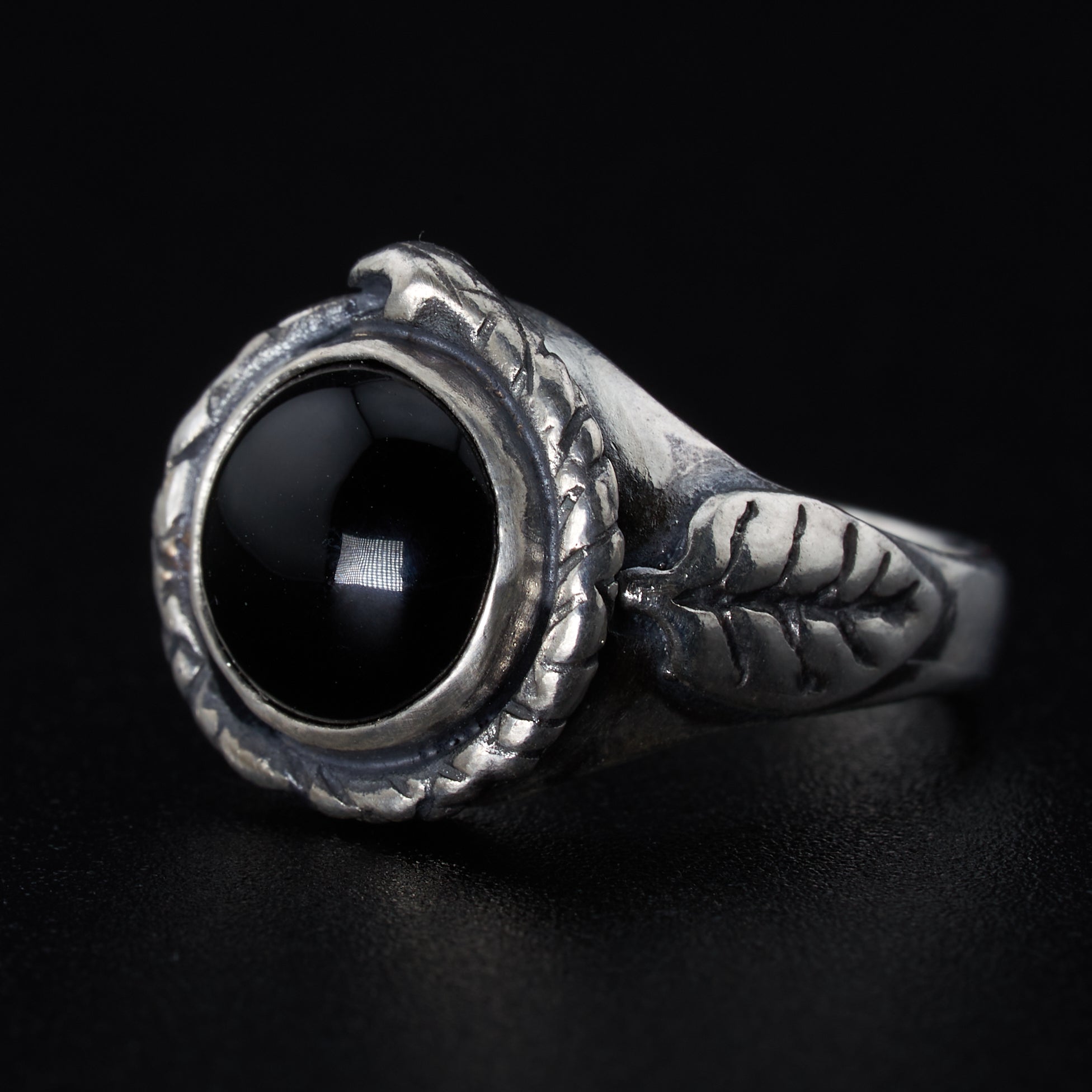The Metal: A 10mm round Black Onyx bezel set with an ouroboros surround, on a sterling silver signet ring with leaves on the shoulders. Made to a size N.