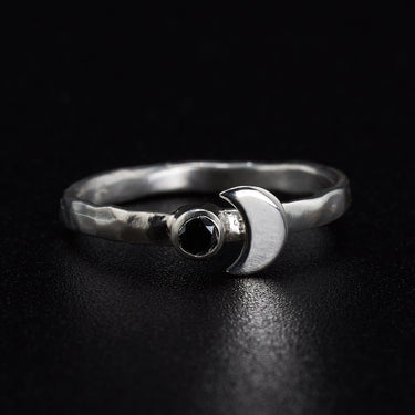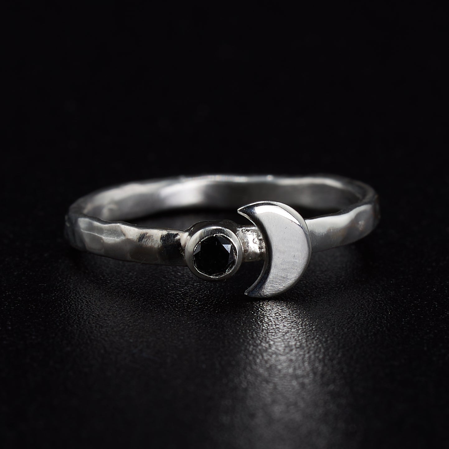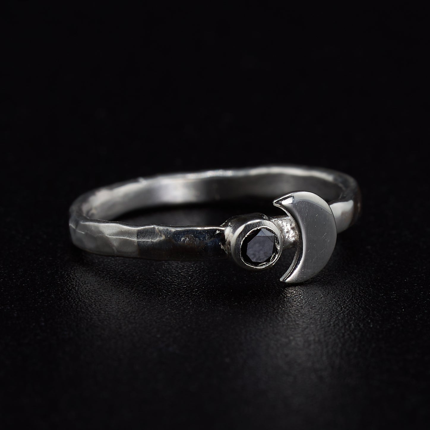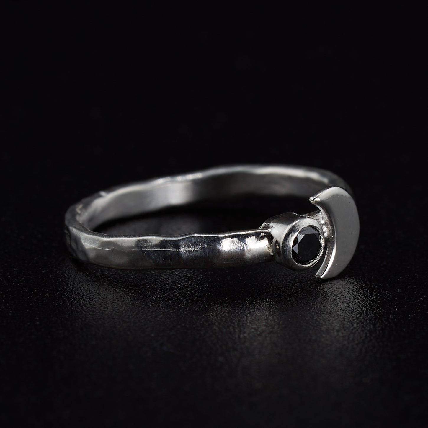 The Magic: The light of a crescent moon captured in silver brings luna magic to your everyday, while a black diamond offers protection and grounding. A tiny diamond moon orbiting your finger as silver spell for hope, resilience and strength.