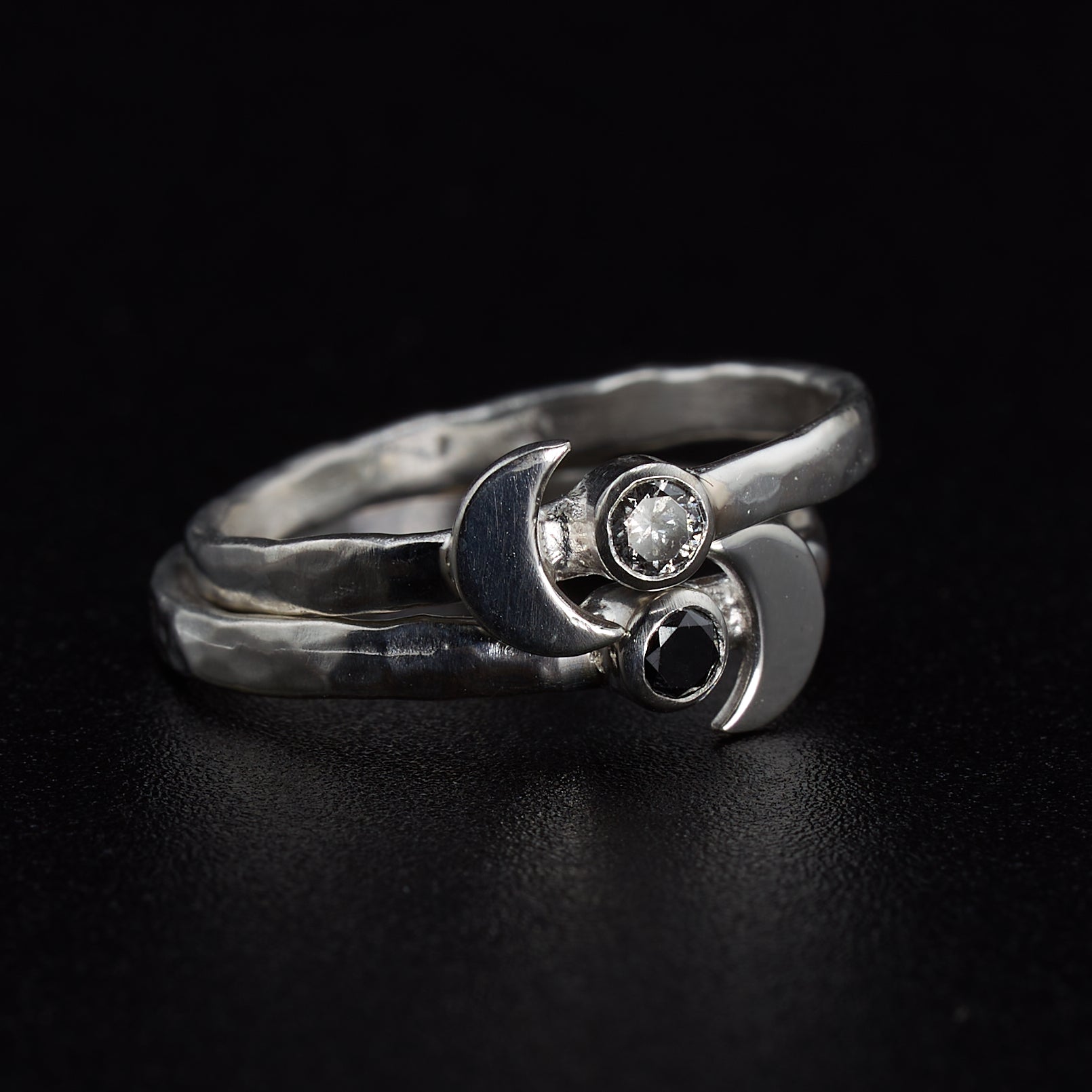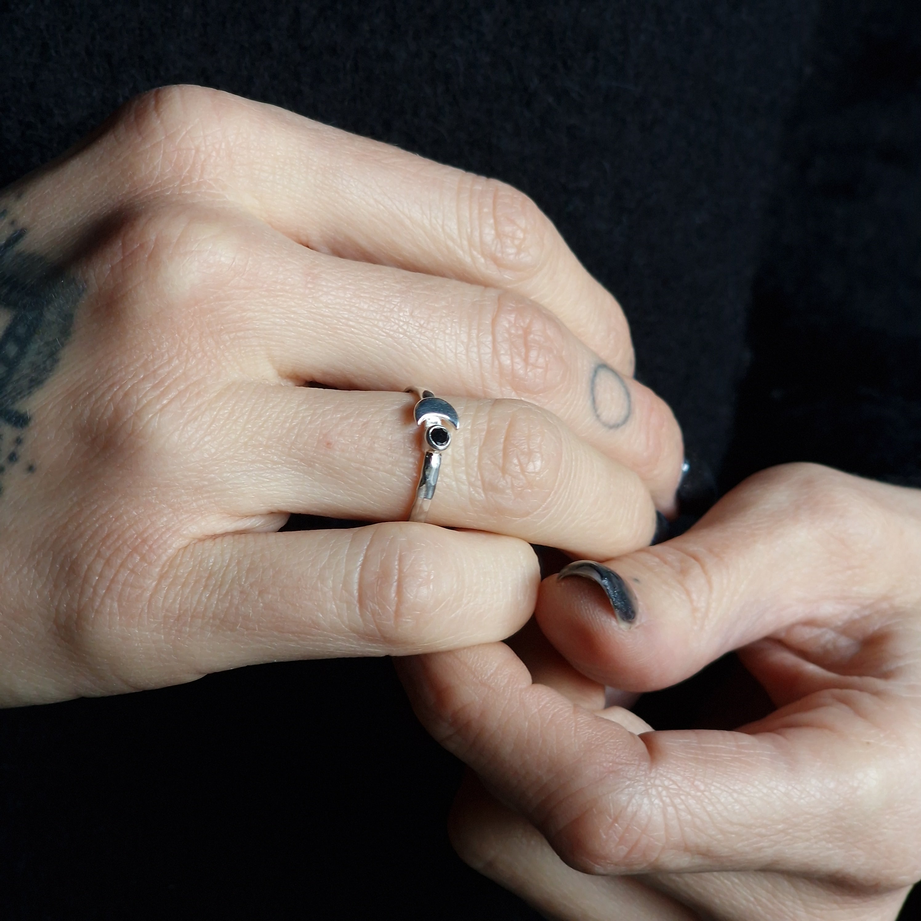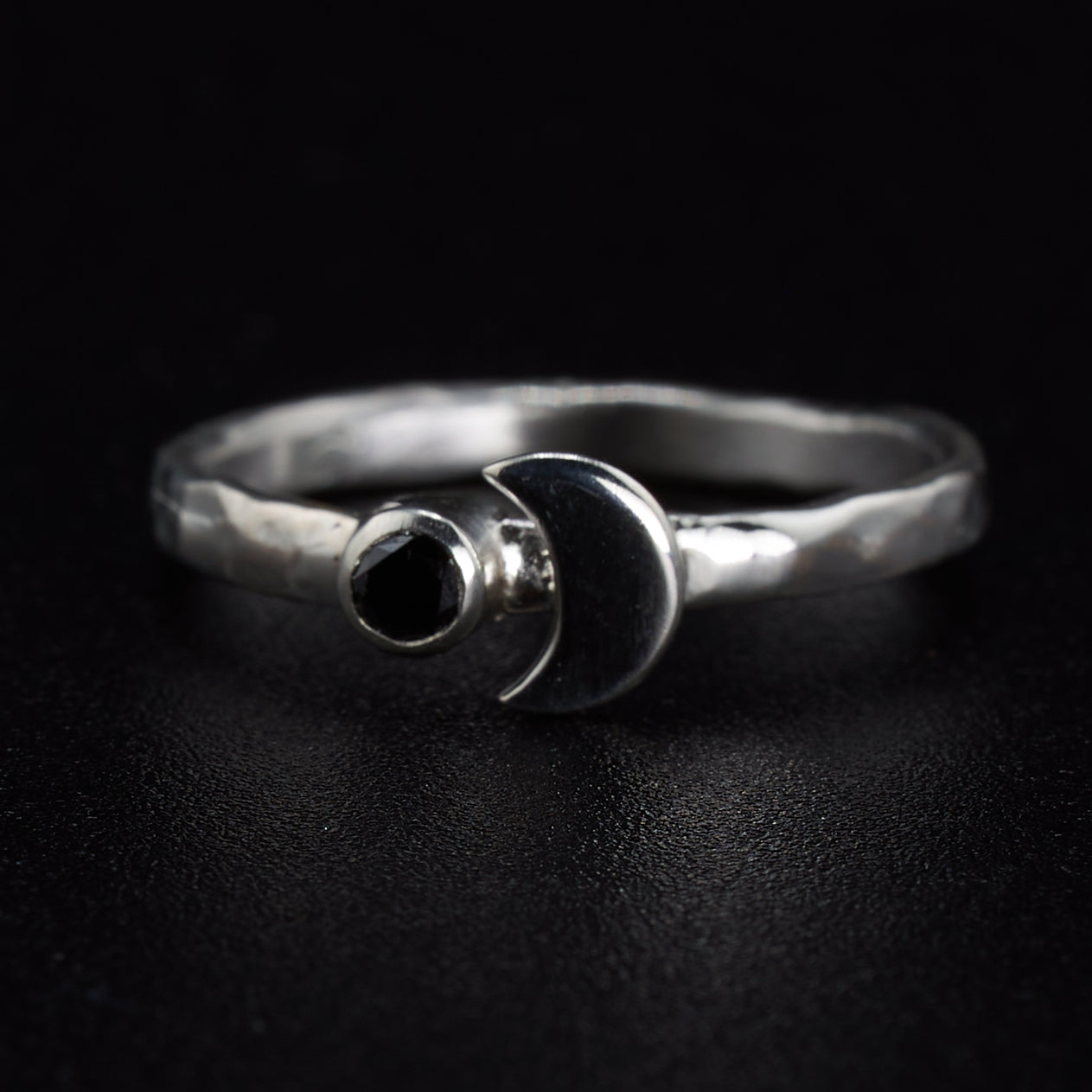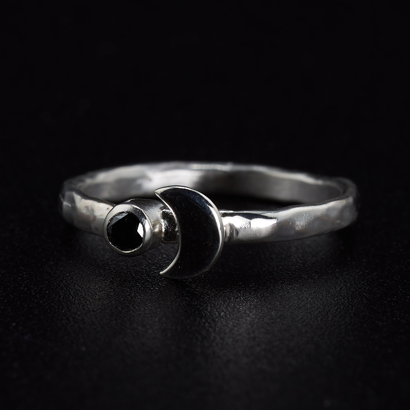 The Magic: The light of a crescent moon captured in silver brings luna magic to your everyday, while a black diamond offers protection and grounding. A tiny diamond moon orbiting your finger as silver spell for hope, resilience and strength.