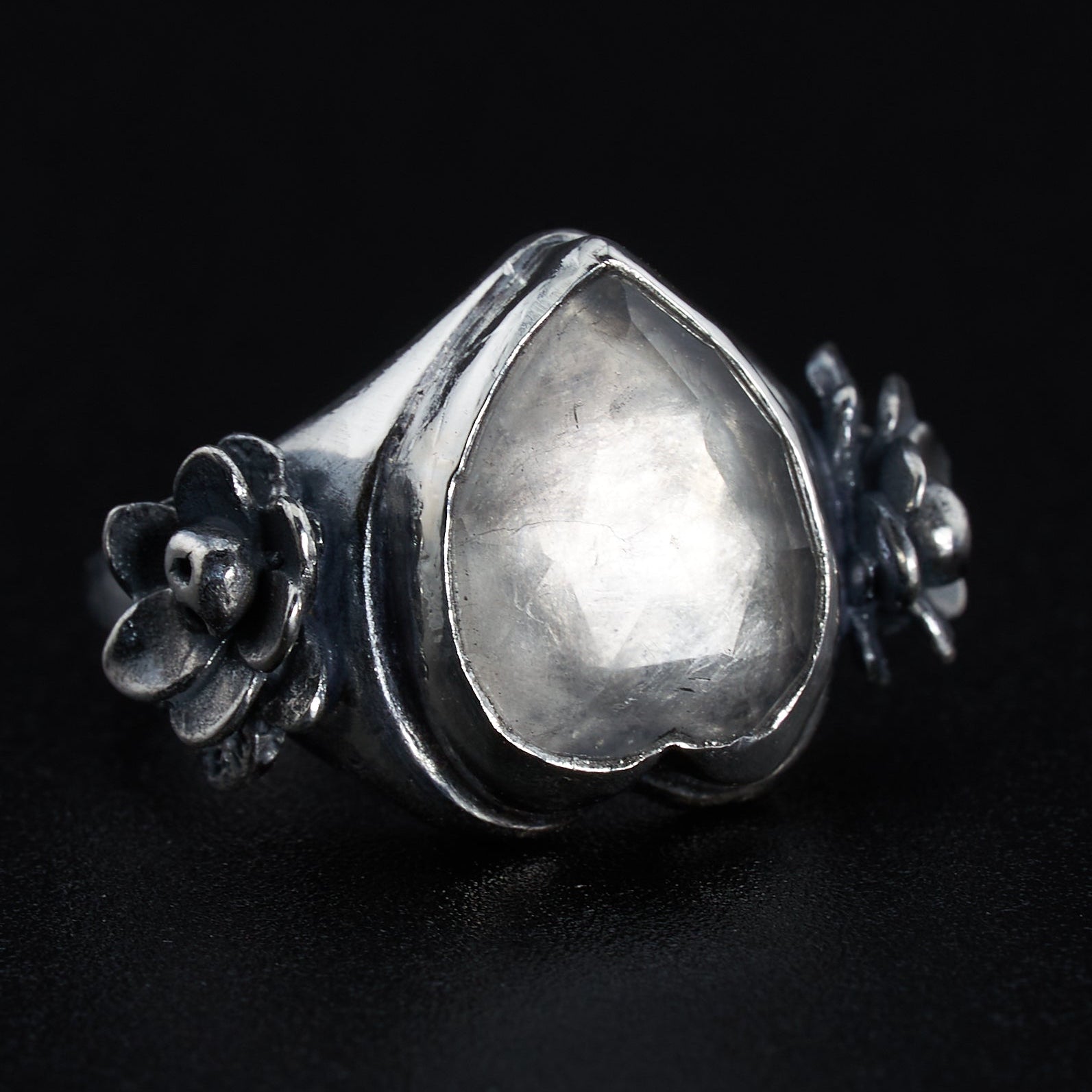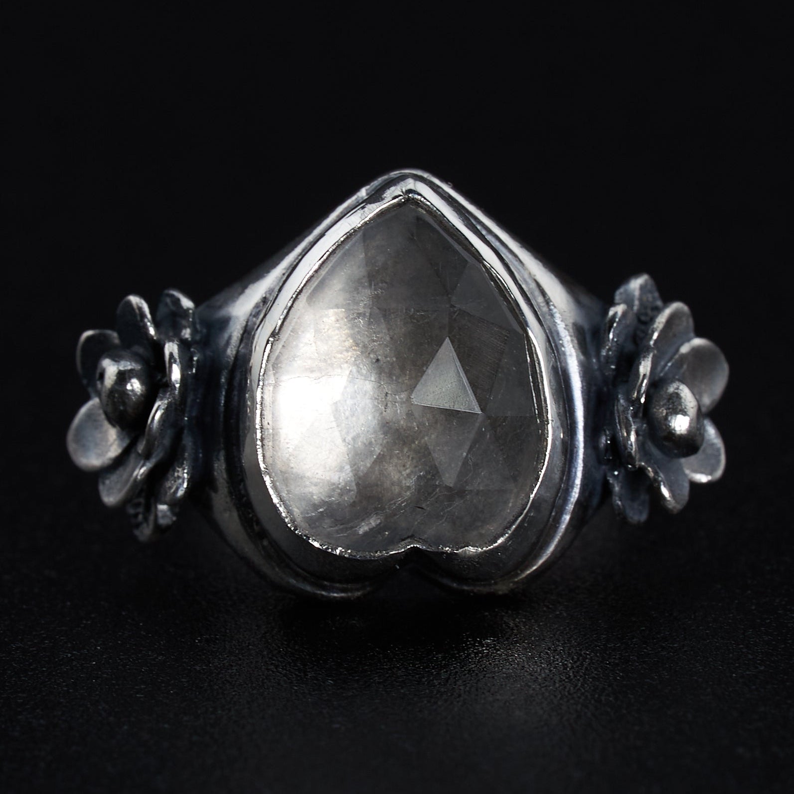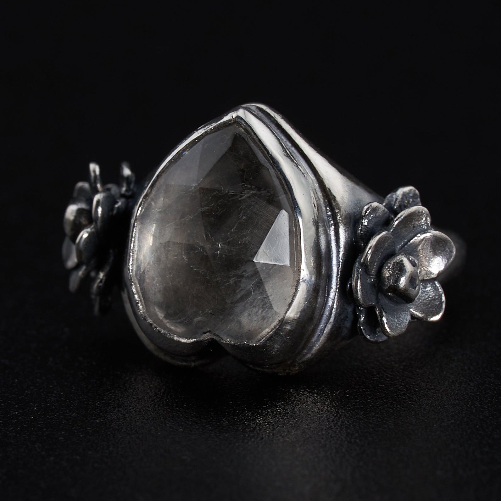The Metal: An 11mm by 14mm heart shaped clear quartz held tightly in a sterling silver bezel on a silver hand carved signet ring with belladonna flowers either side. This ring is a size M.