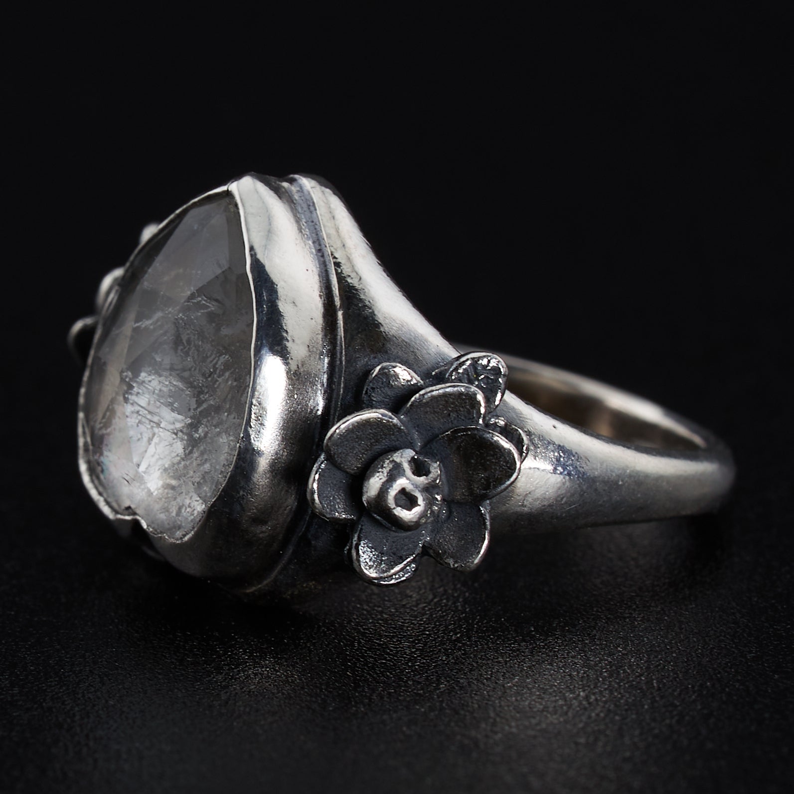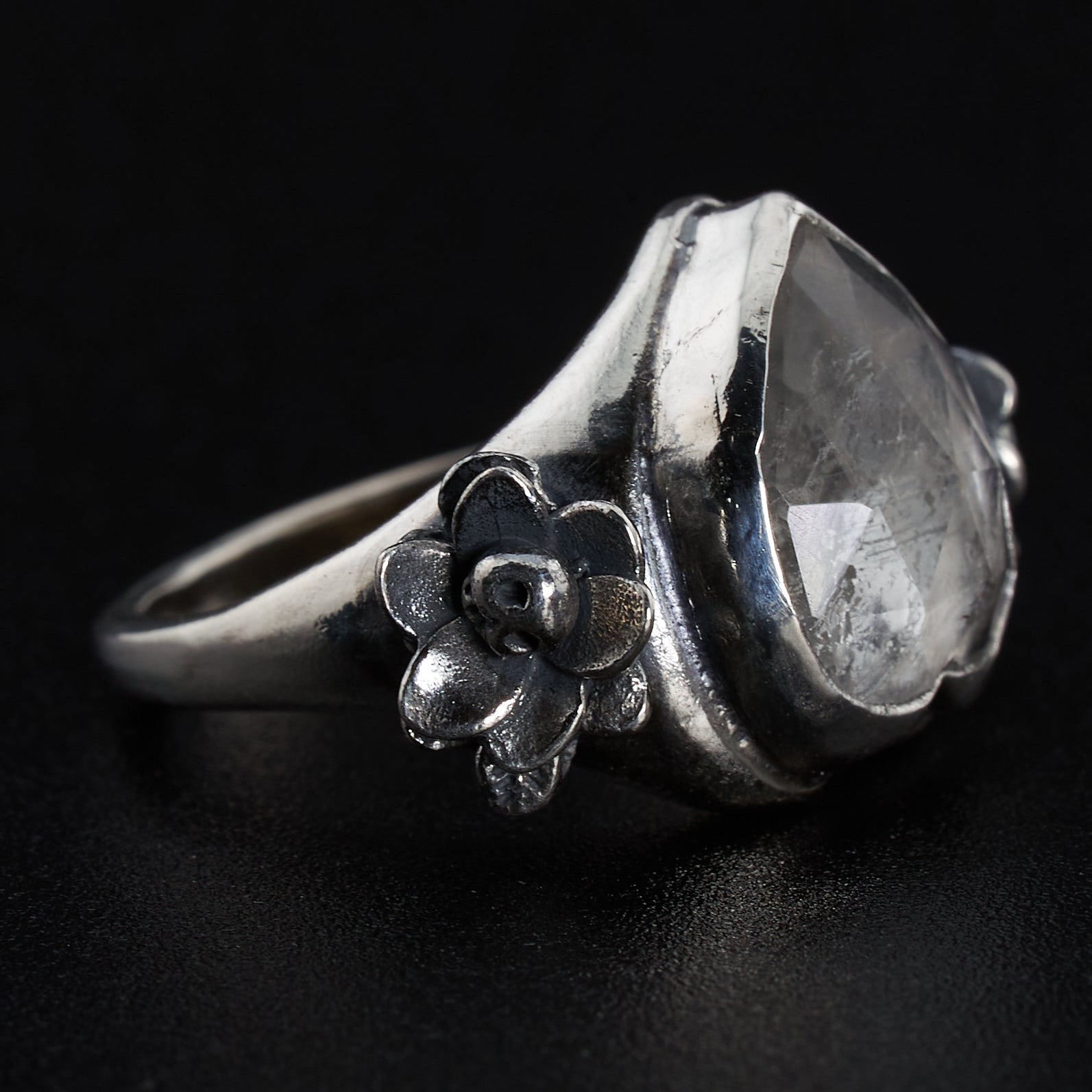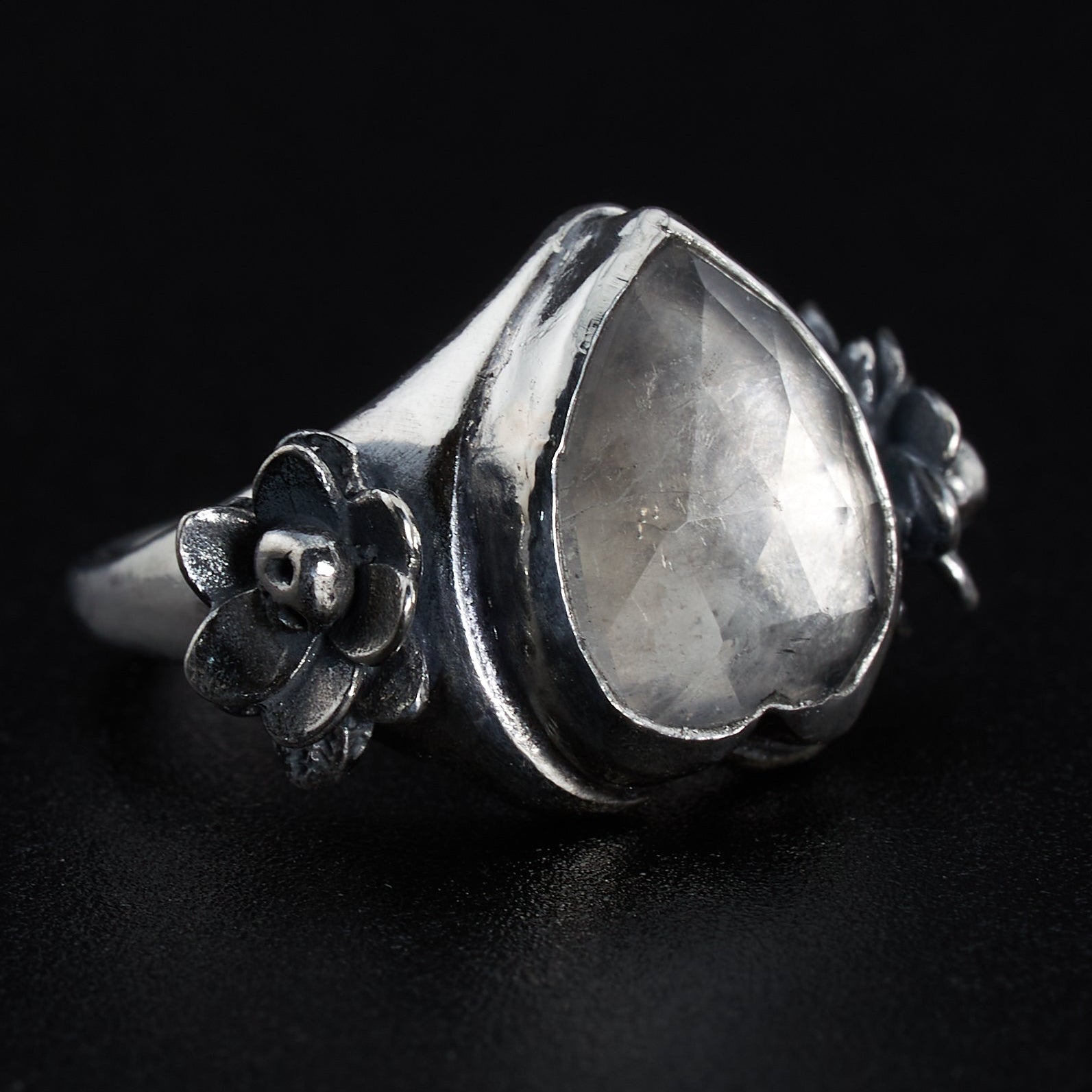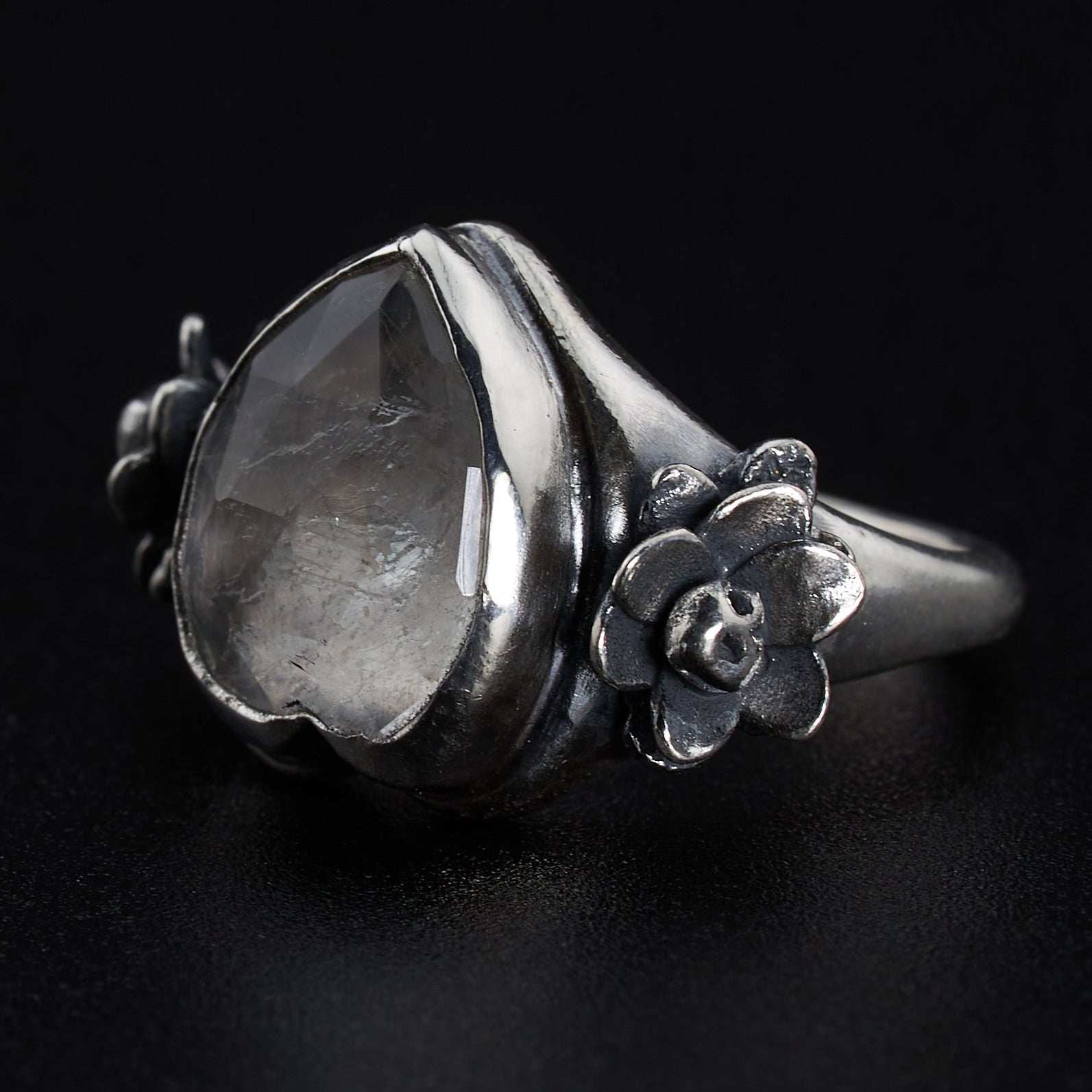 The Metal: An 11mm by 14mm heart shaped clear quartz held tightly in a sterling silver bezel on a silver hand carved signet ring with belladonna flowers either side. This ring is a size M.