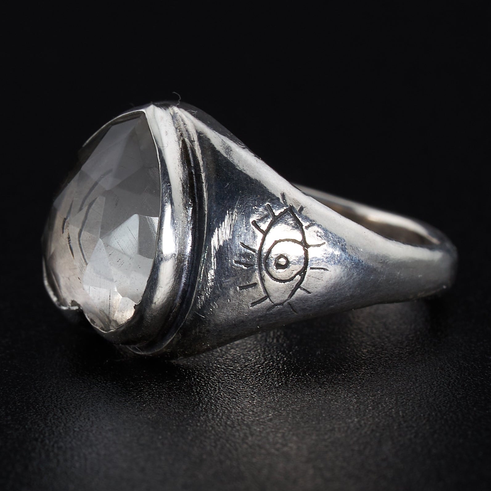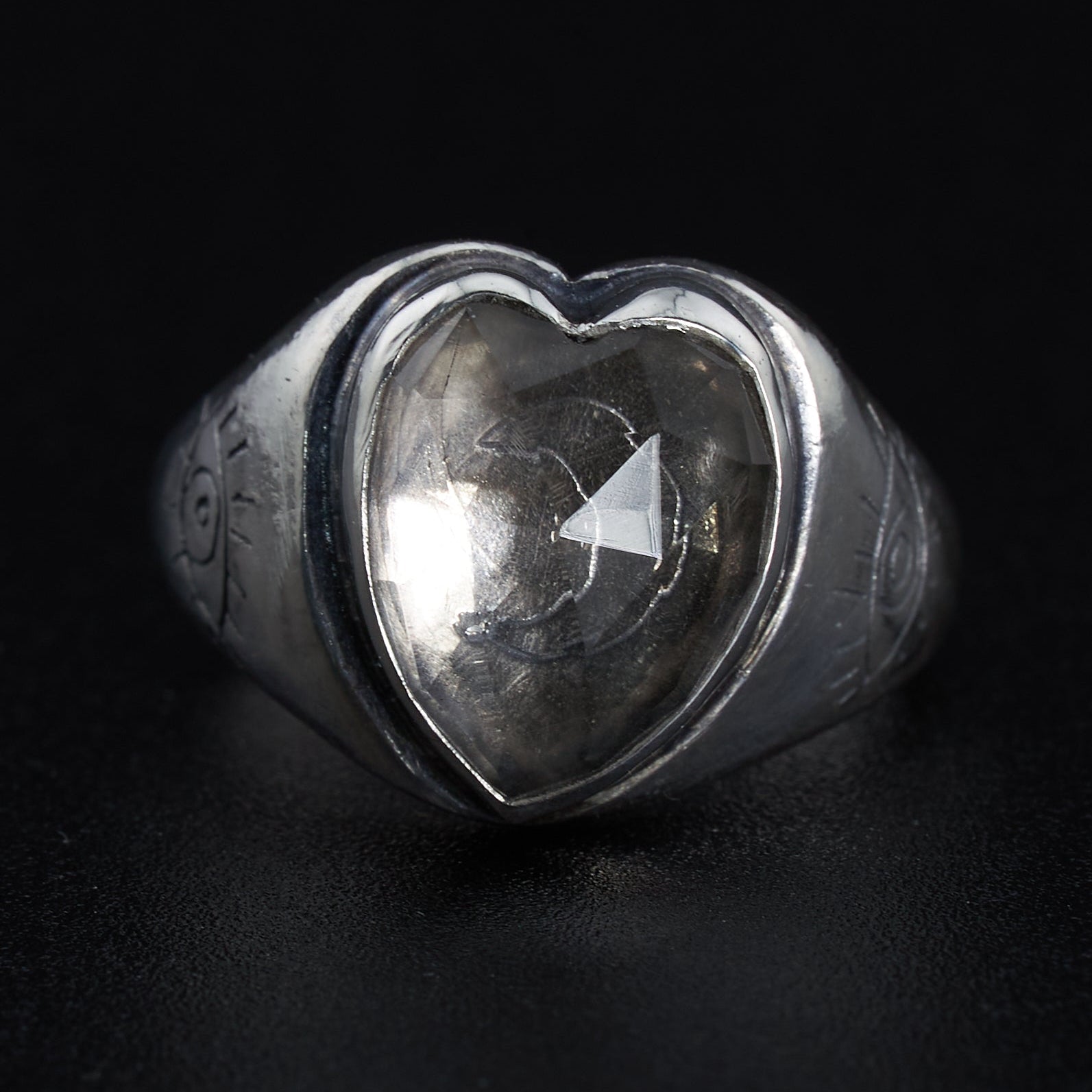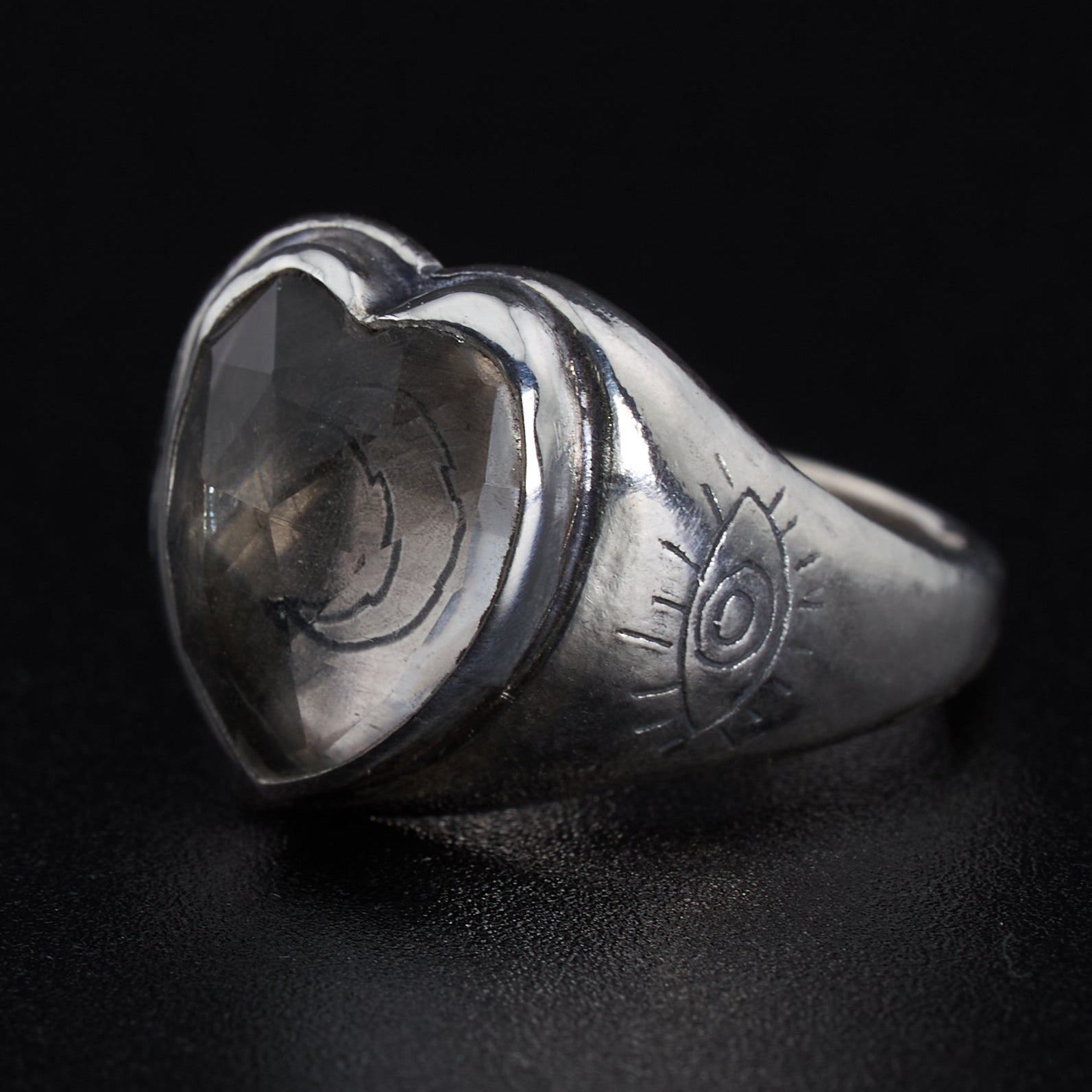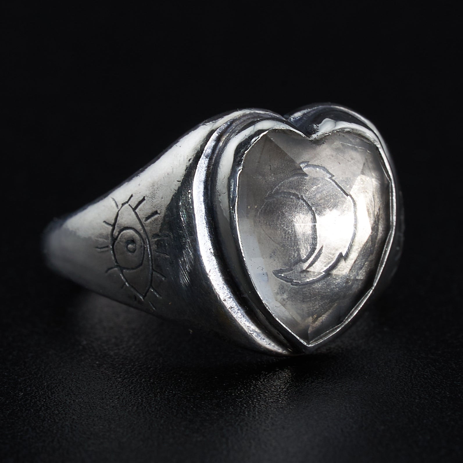 The Metal: A 10mm by 14mm heart shaped clear quartz held tightly in a sterling silver bezel pierced on a silver hand carved signet ring. This ring is a size Q.