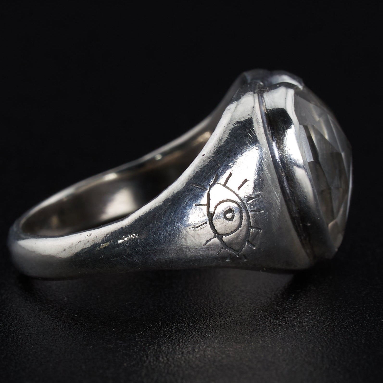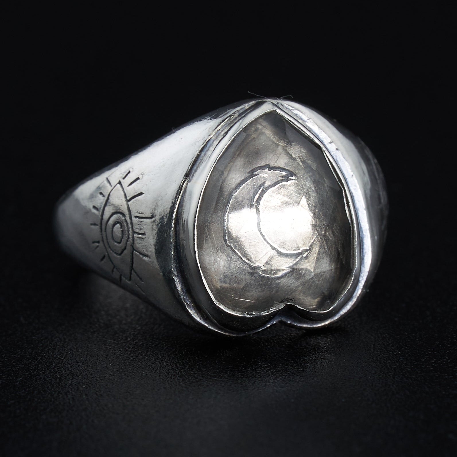 The Magic: A Clear Quartz heart refracts light into a hand-engraved moon, a symbol of intuition and lunar power. Hand engraved eyes on the shoulders focus your vision and sharpen your sight.
