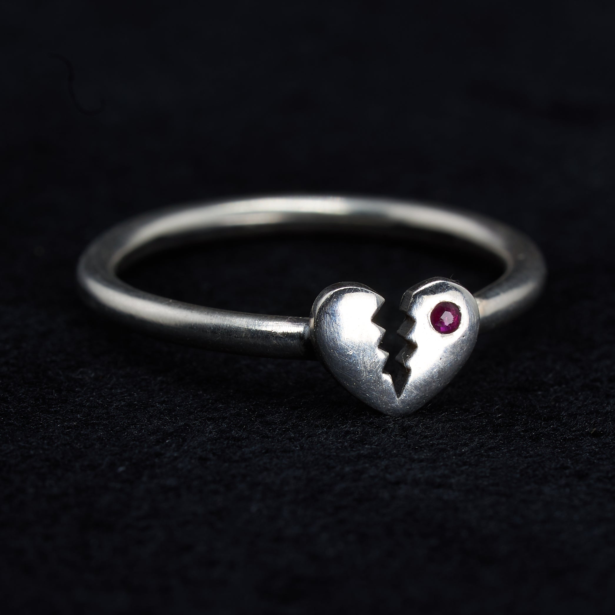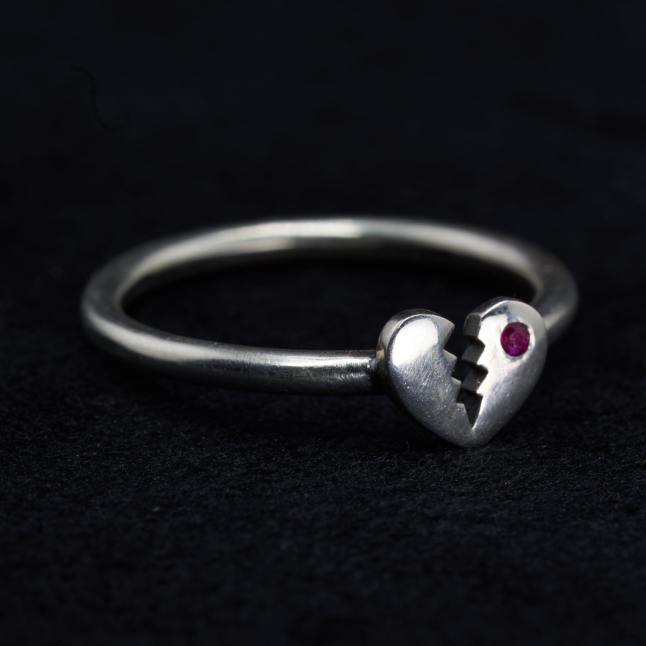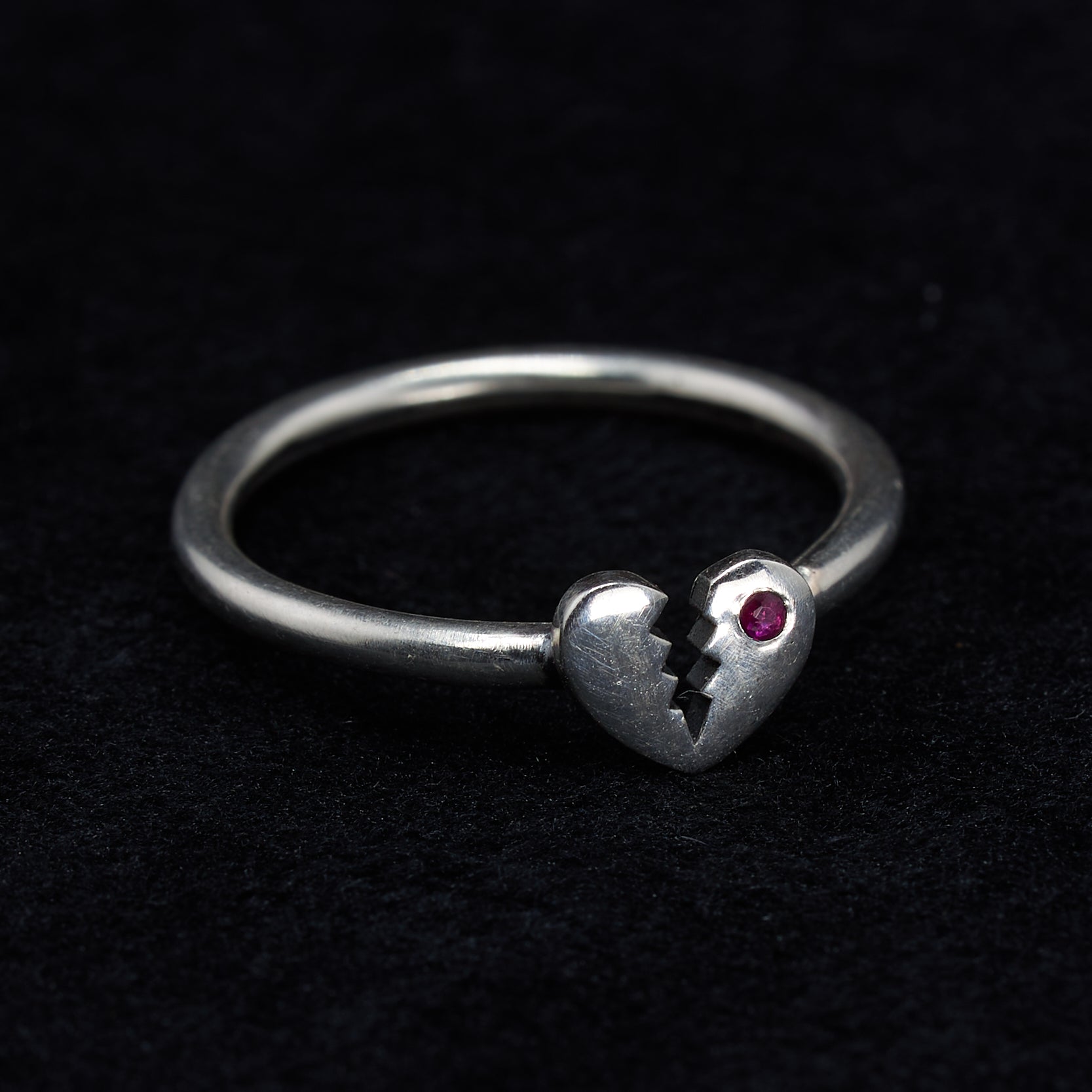 The Magic: A solid silver heart, broken but still shining, a 1.25mm crimson ruby on one side. This ring is for those who have loved deeply and chosen to keep their hearts open. A talisman for those who wear their hearts on the outside, despite the dangers.