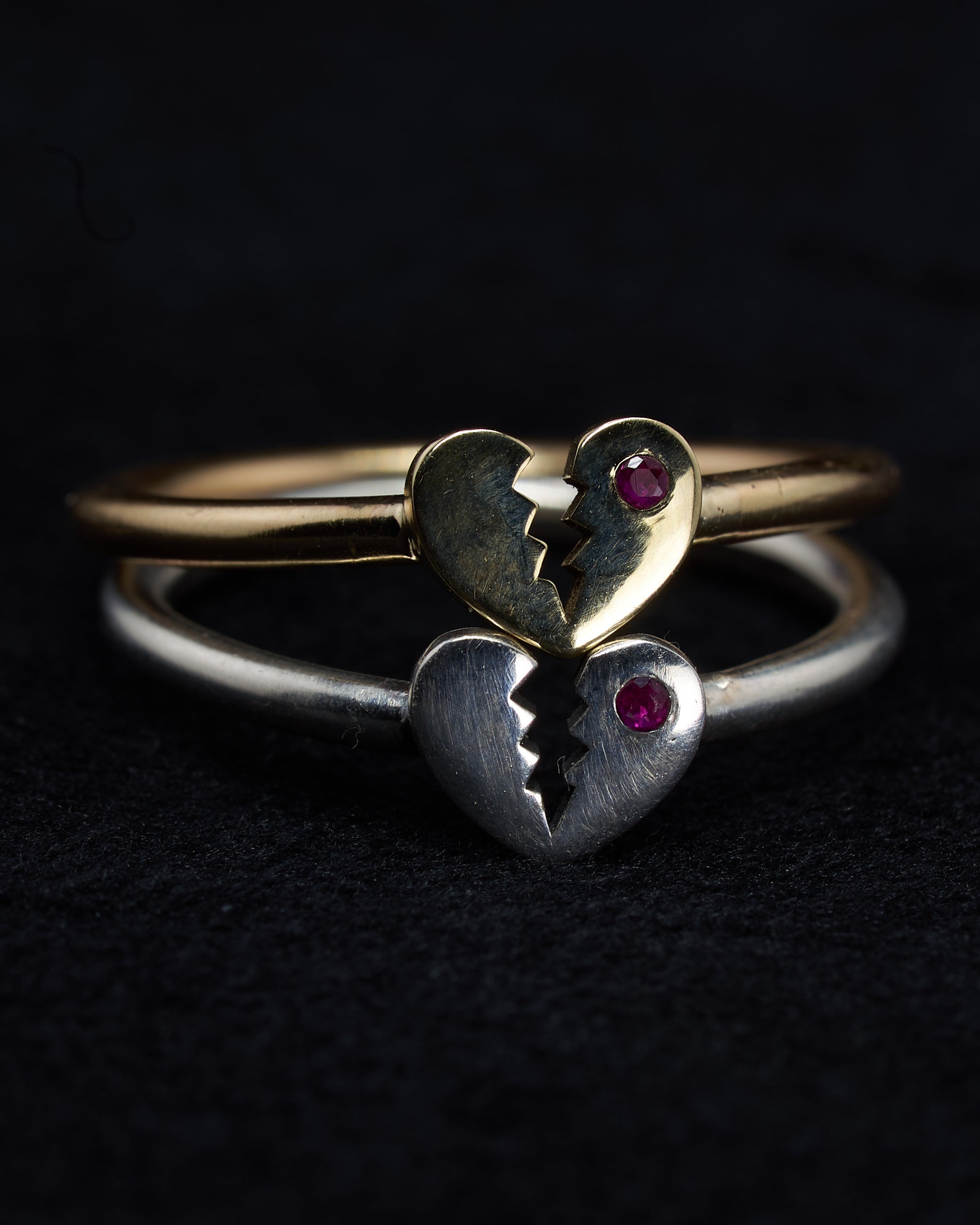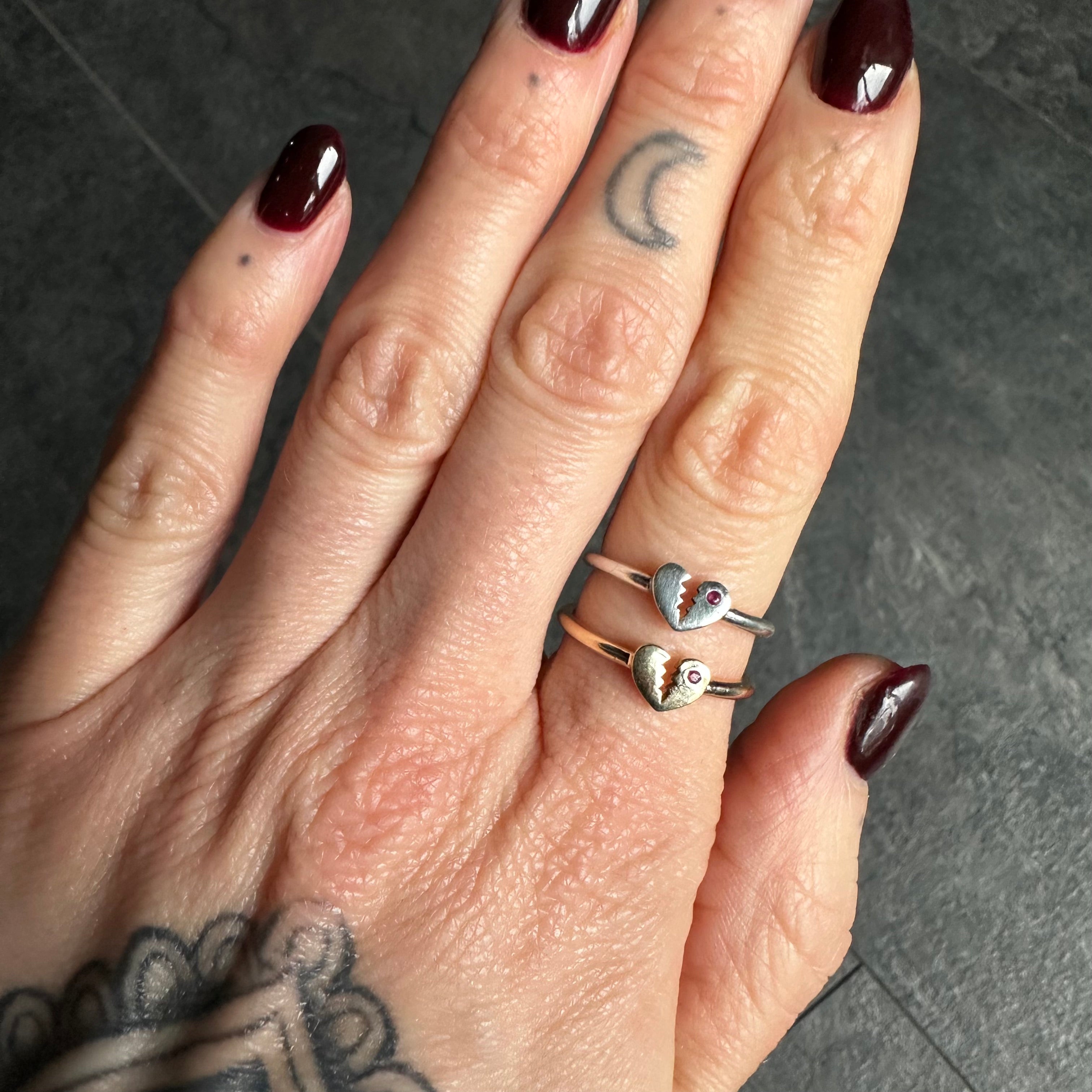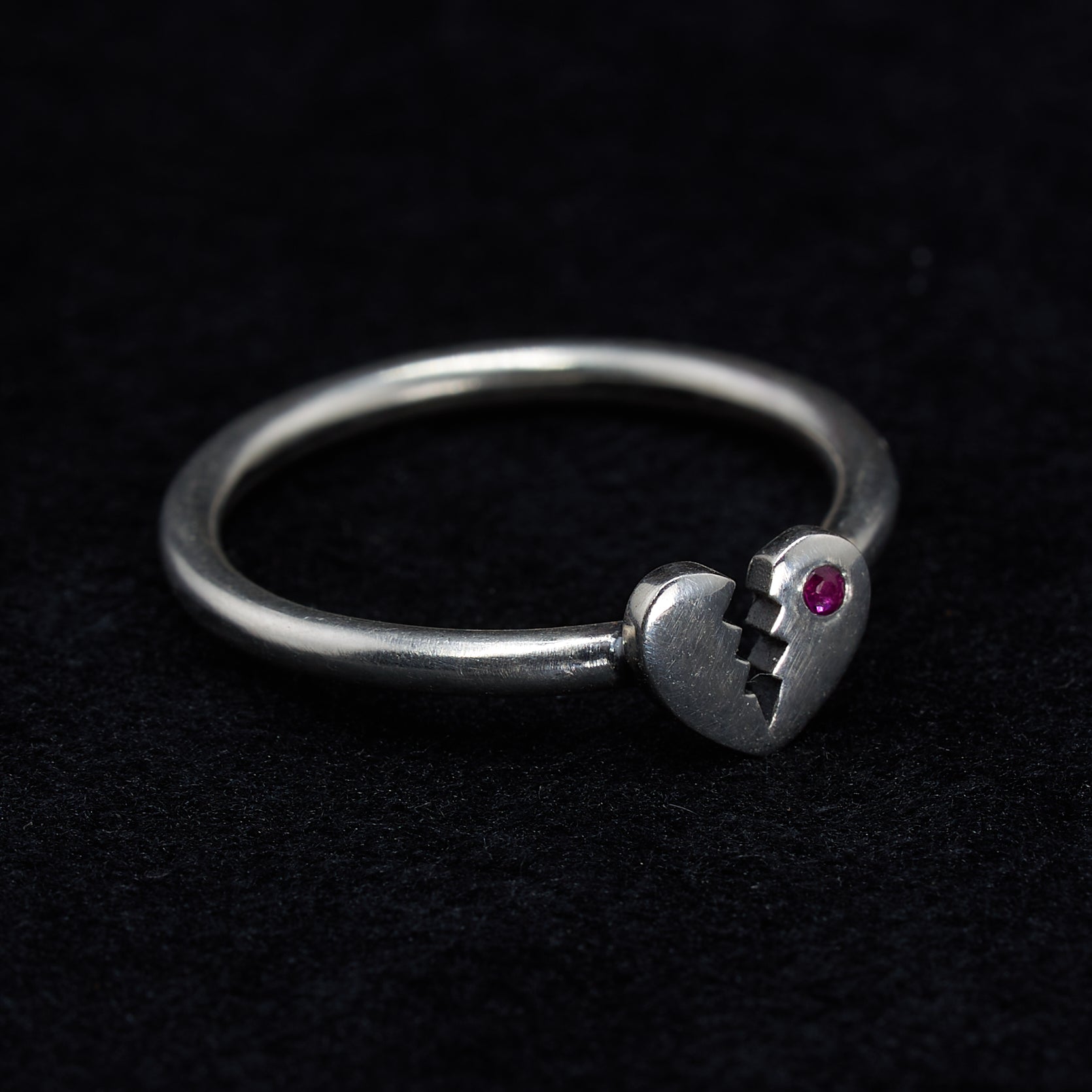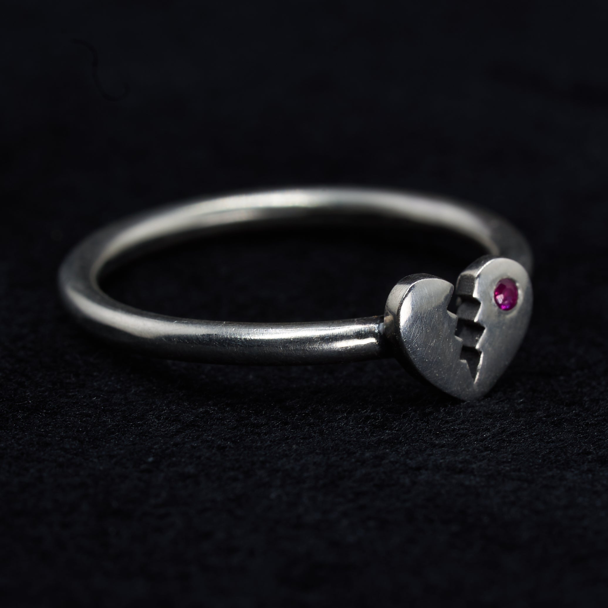 The Magic: A solid silver heart, broken but still shining, a 1.25mm crimson ruby on one side. This ring is for those who have loved deeply and chosen to keep their hearts open. A talisman for those who wear their hearts on the outside, despite the dangers.