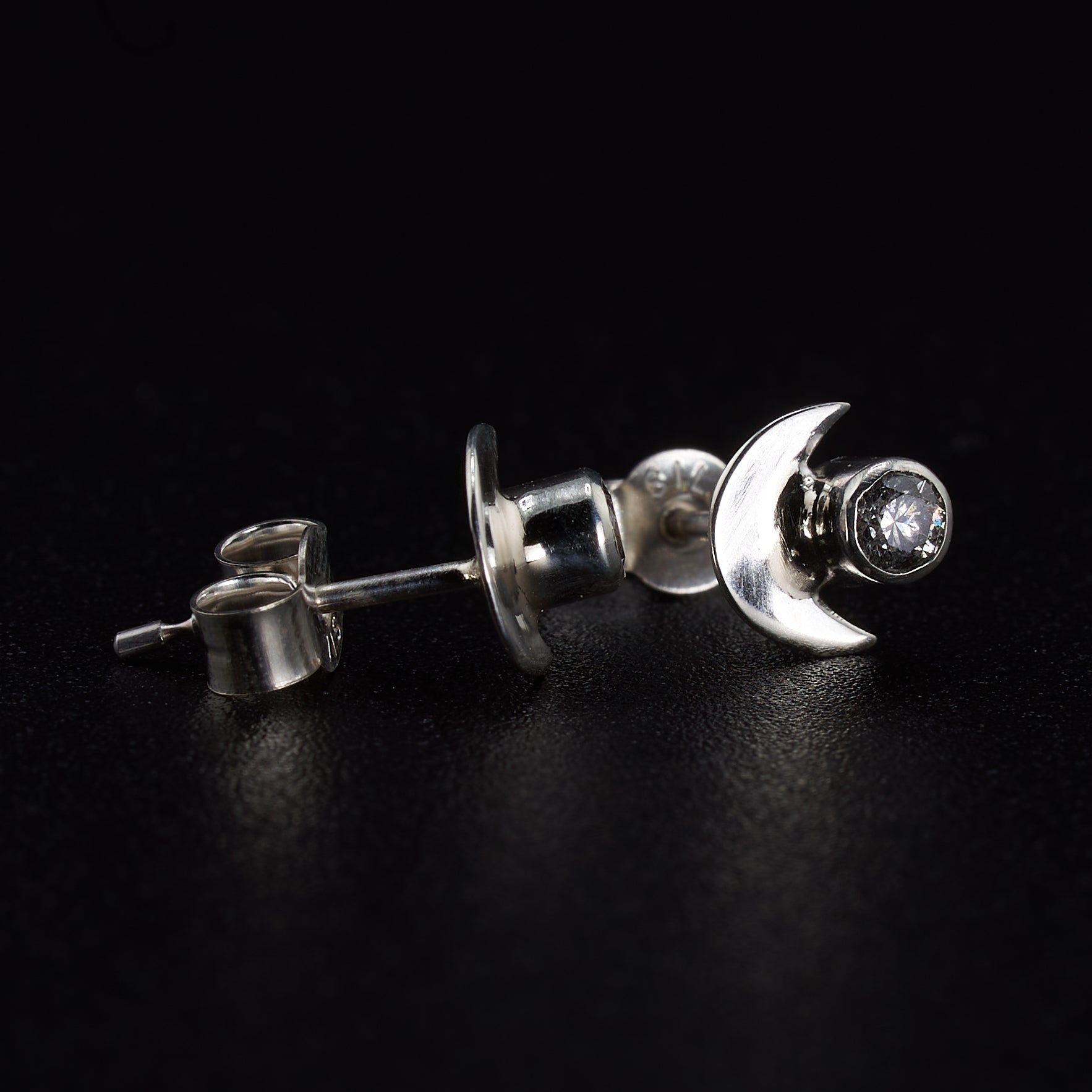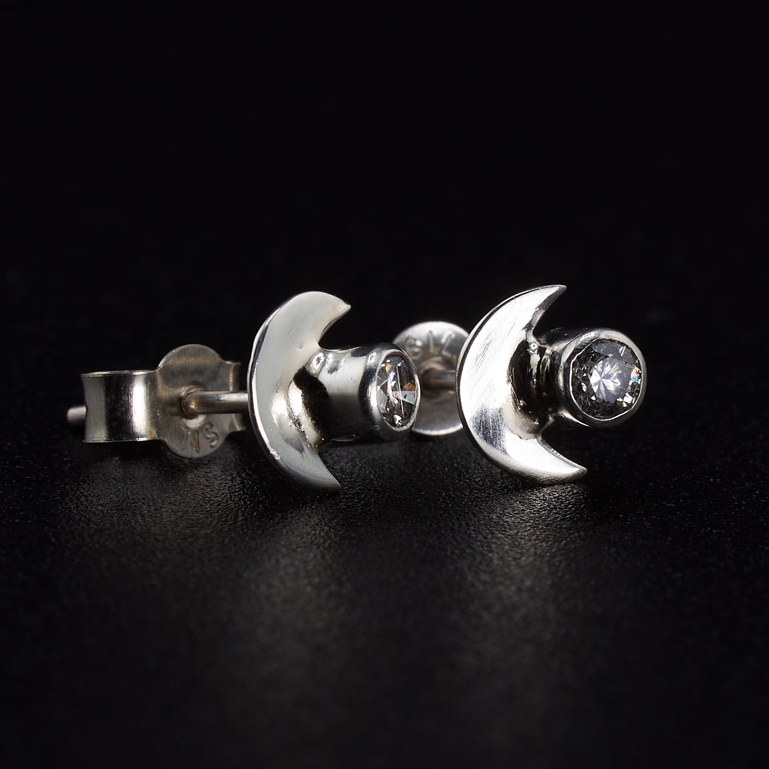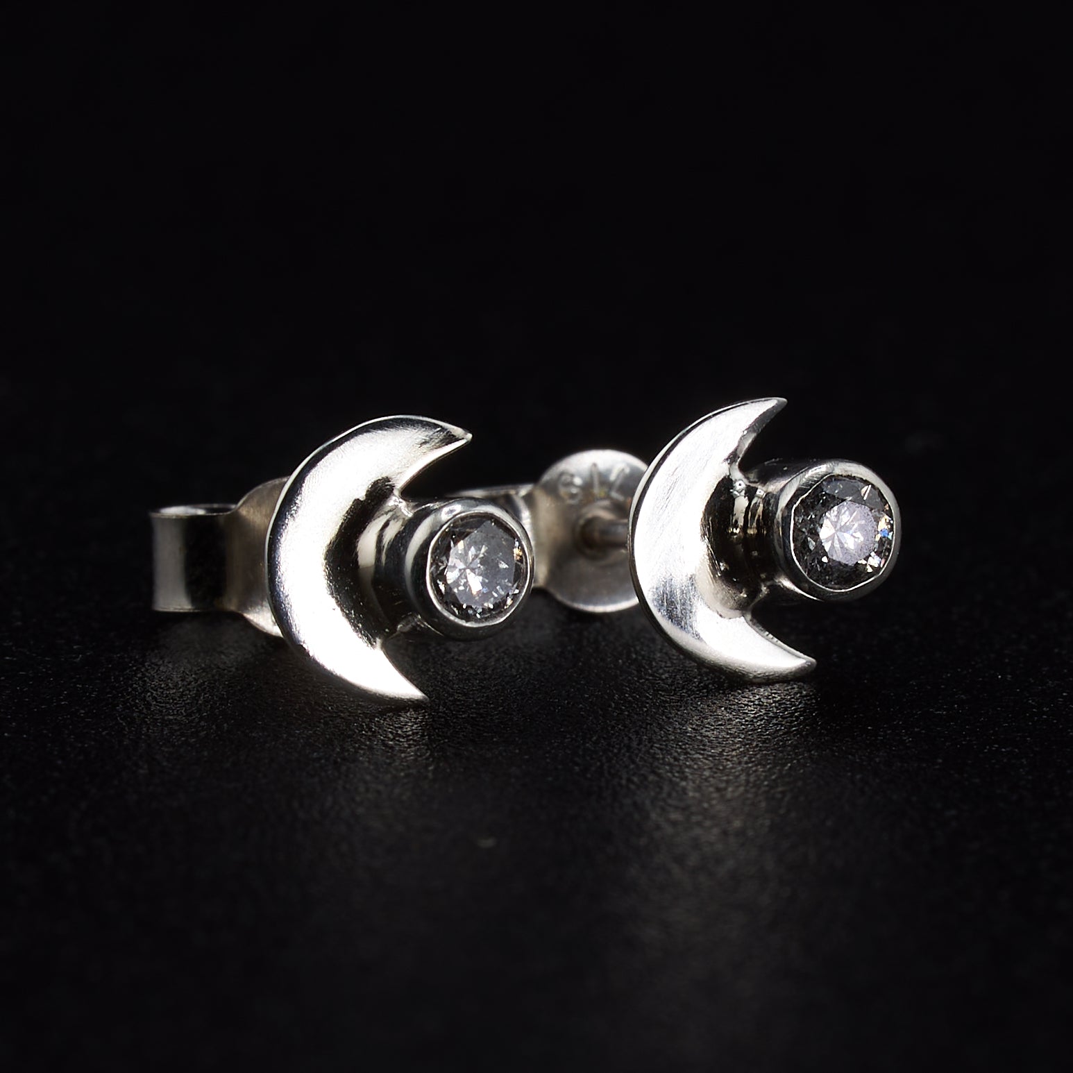The Magic: The light of a crescent moon captured in silver brings luna magic to your everyday, while salt & pepper diamonds whisper words of earthly wisdom into your ears. A silver spell for hope, resilience and strength.