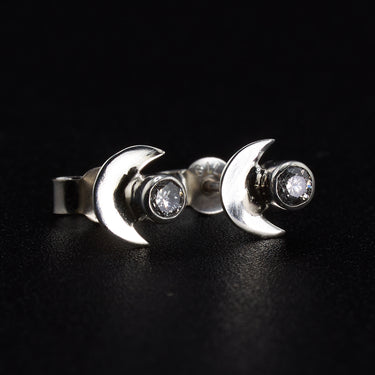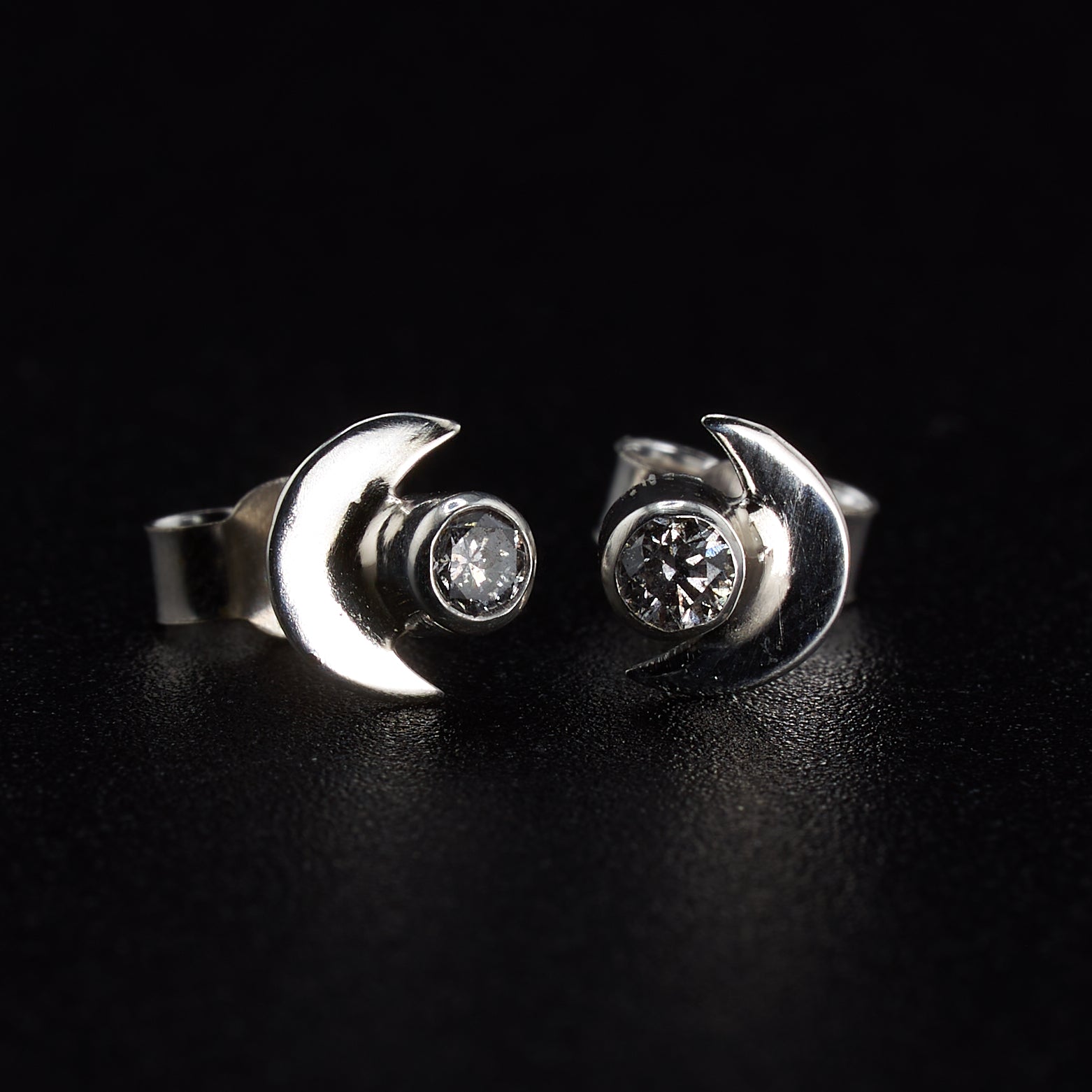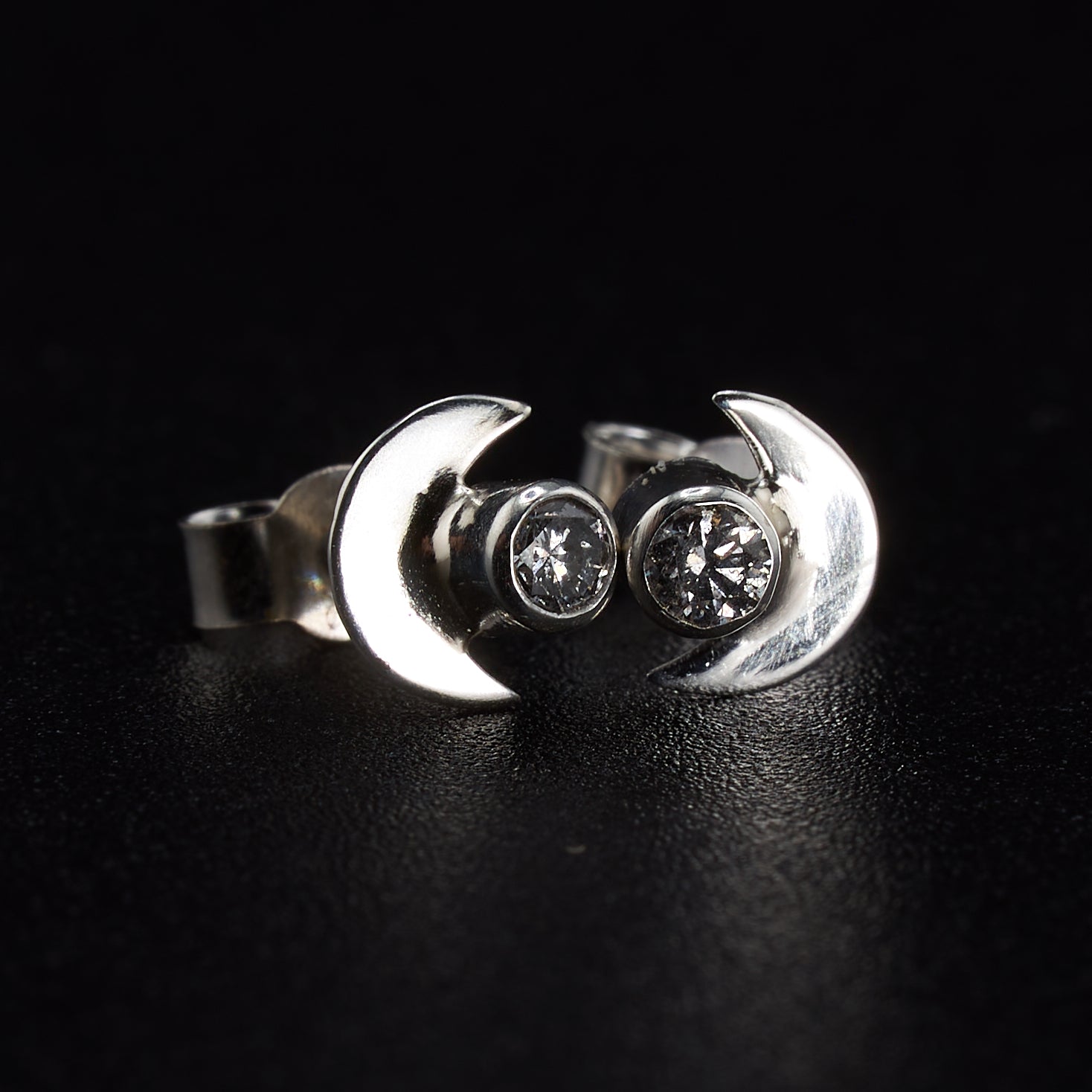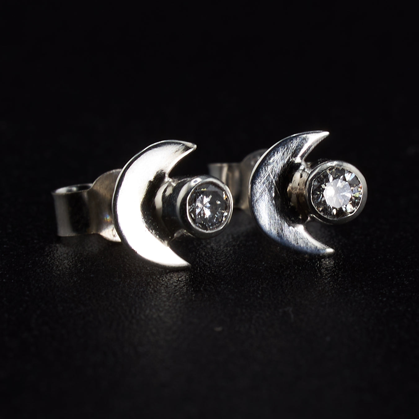 The Magic: The light of a crescent moon captured in silver brings luna magic to your everyday, while salt & pepper diamonds whisper words of earthly wisdom into your ears. A silver spell for hope, resilience and strength.