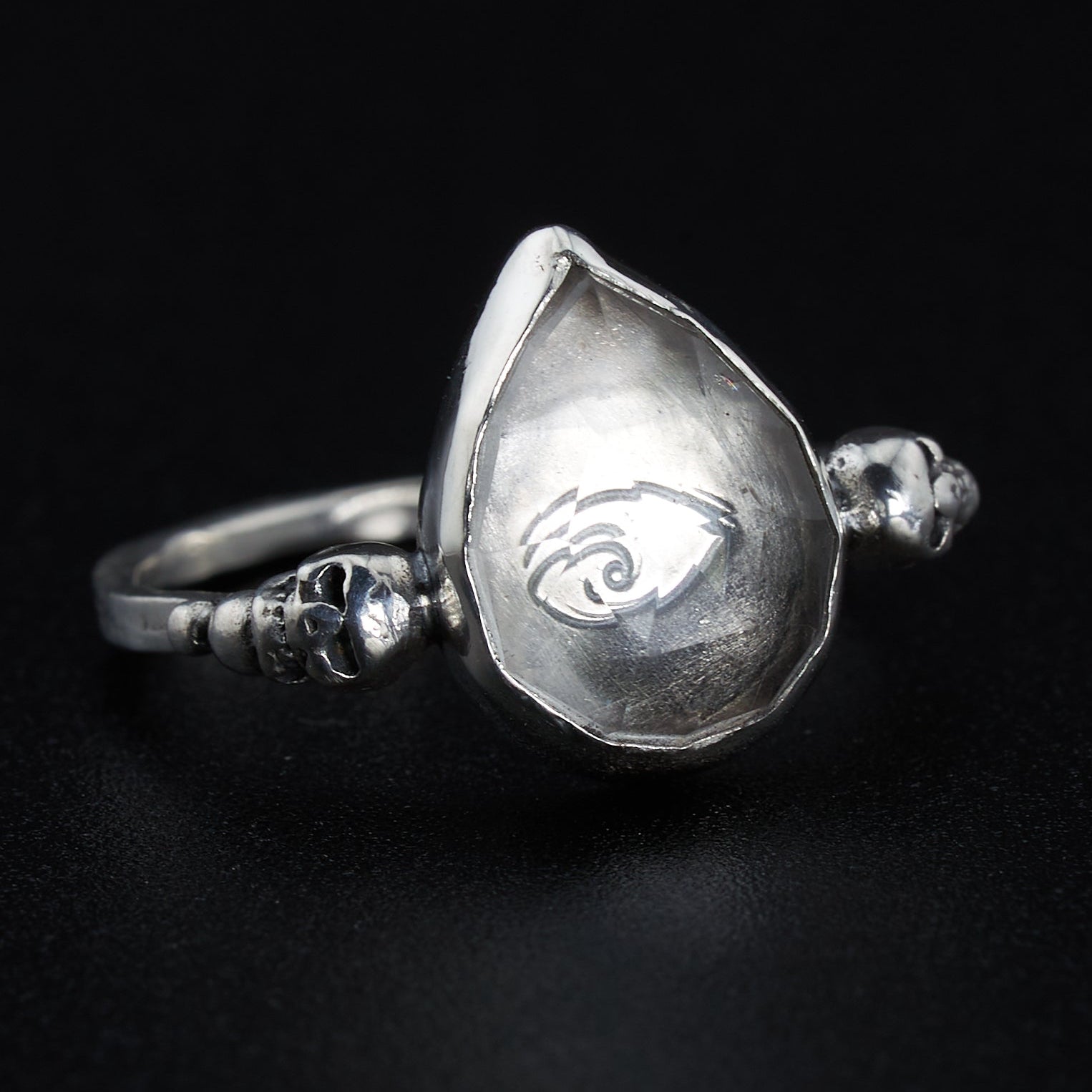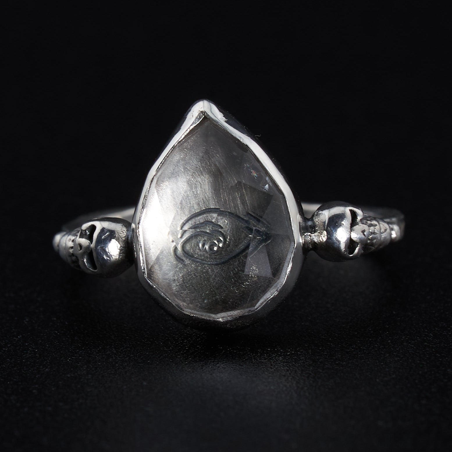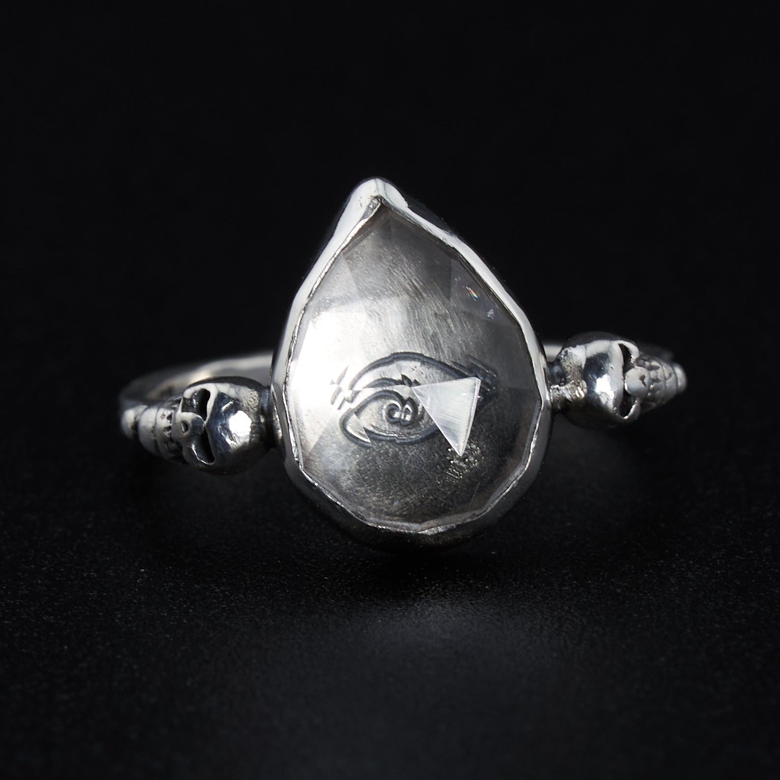 The Magic: A Clear Quartz heart refracts light into a hand-stamped eye, focusing your vision and sharpening inner sight. Skulls on the sides serve as a memento mori and protectors of your energy.