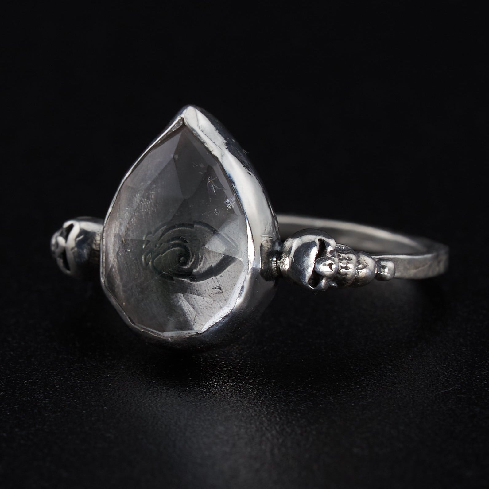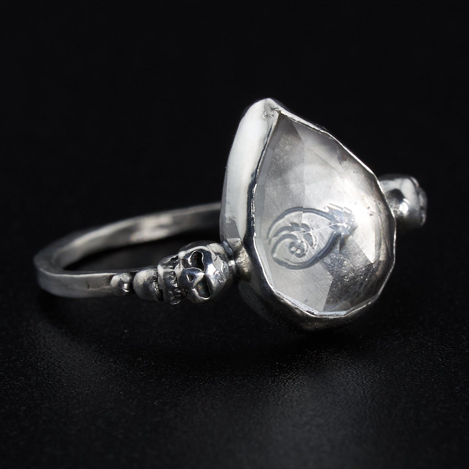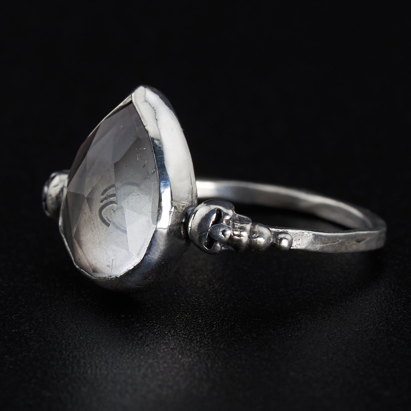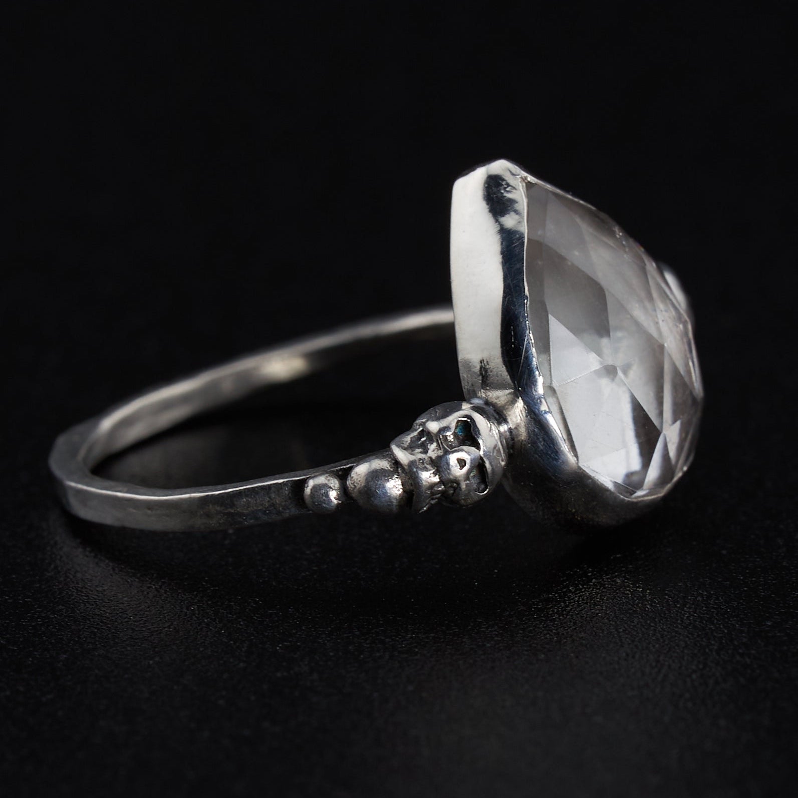 The Metal: A 10mm by 14mm heart shaped clear quartz held tightly in a sterling silver bezel on a hammered band with two silver skulls ring. This ring will be made to order and is available in all sizes.