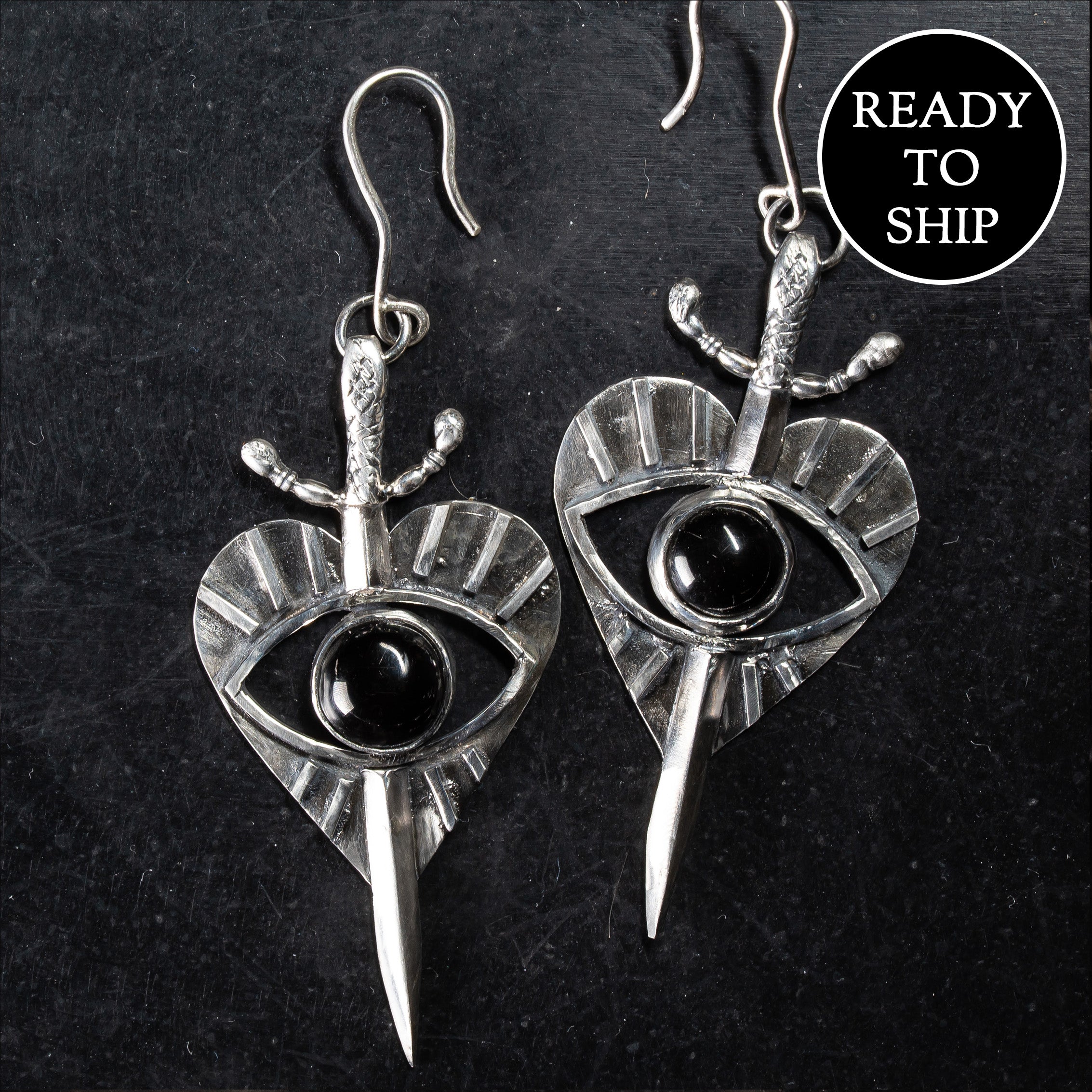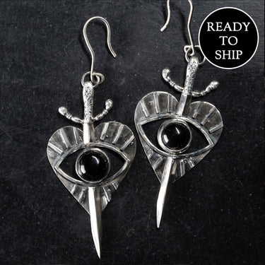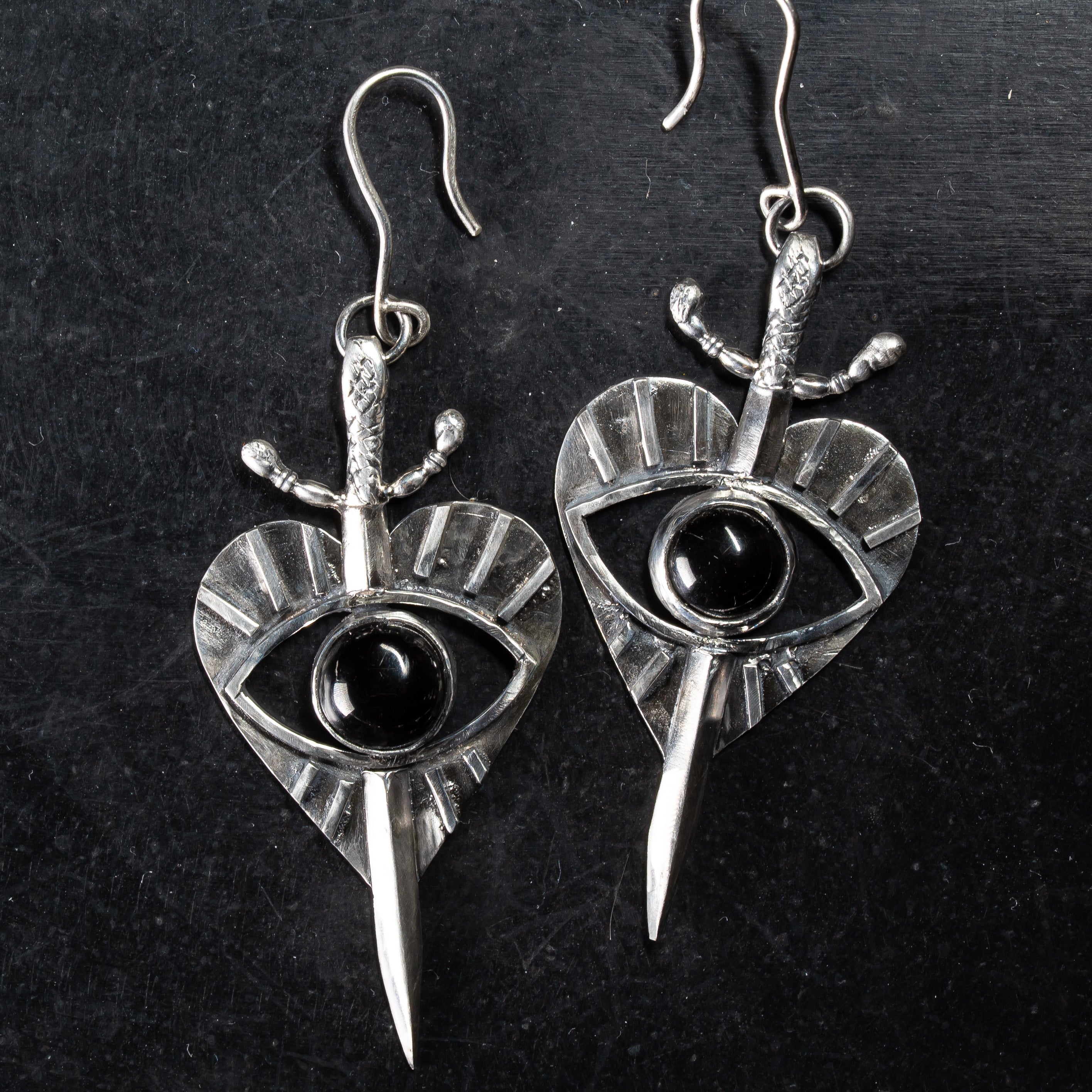 The Magic: A dagger with a snakes head hilt, piecing an eye with a heart, the gothic symbolism in this pendant is heavy. At it's centre Jet reminds us that everything dies and will be transformed. As it is deeply protective Jet has been used to guide souls to the underworld for centuries.
