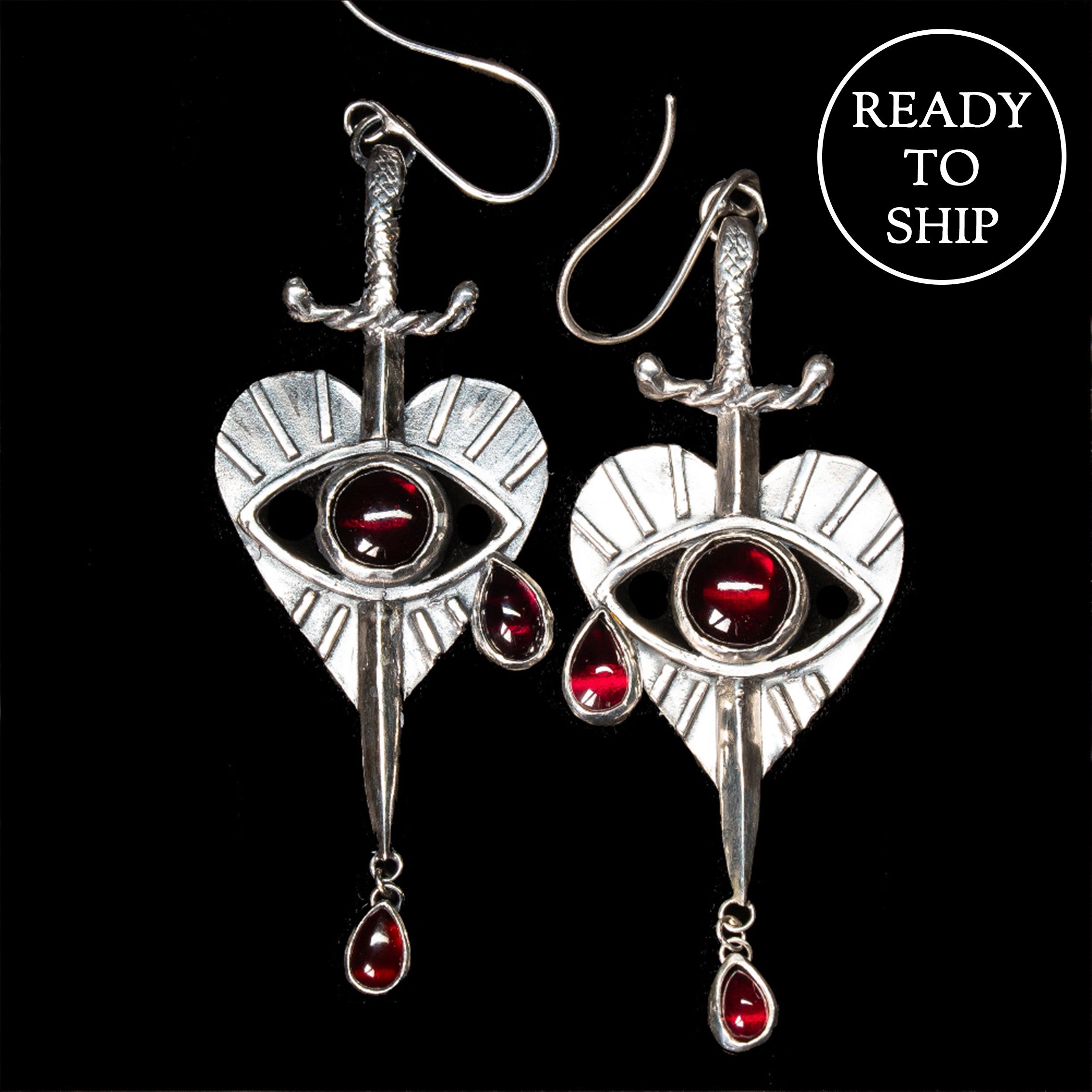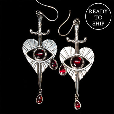 The Metal: Two sword pierced sacred hearts with a 10mm round garnet eye in the centre. A pear shaped garnet tear and a slightly smaller pear shaped garnet dripping from the point of the blade. Each earring measures 92mm in length from hook to tip and 28mm at its widest point and weighs 9g.